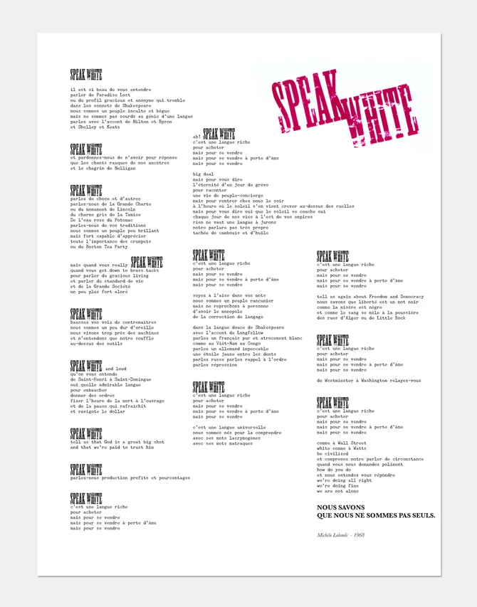 Le poème a été lu sur la scène de la Comédie canadienne par la comédienne Michelle Rossignol lors d'un spectacle intitulé Chansons et poèmes de la Résistance, par la suite lors des tournées du spectacle, ce fut Michèle Lalonde qui fit la lecture du poème. Le spectacle qui réunissait plusieurs artistes dont Robert Charlebois, Yvon Deschamps et Gaston Miron était organisé pour soutenir la cause de Pierre Vallières et de Charles Gagnon, qui venaient d'être emprisonnés pour leurs activités au sein du Front de Libération du Québec. Speak White est un appui tacite au livre révolutionnaire du journaliste Pierre Vallières « Nègres Blancs d’Amérique », qui venait d’être saisi par la police en vue du procès qu’on voulait lui intenter.