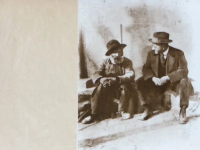 Germain Nouveau et l'un de ses proches, dans une rue d'Aix-en-Povence, carte postale éditée par Maïté Pin-Dabadie. Le tirage de cette photographie fut effectué un peu après le décès du poète, en 1921.