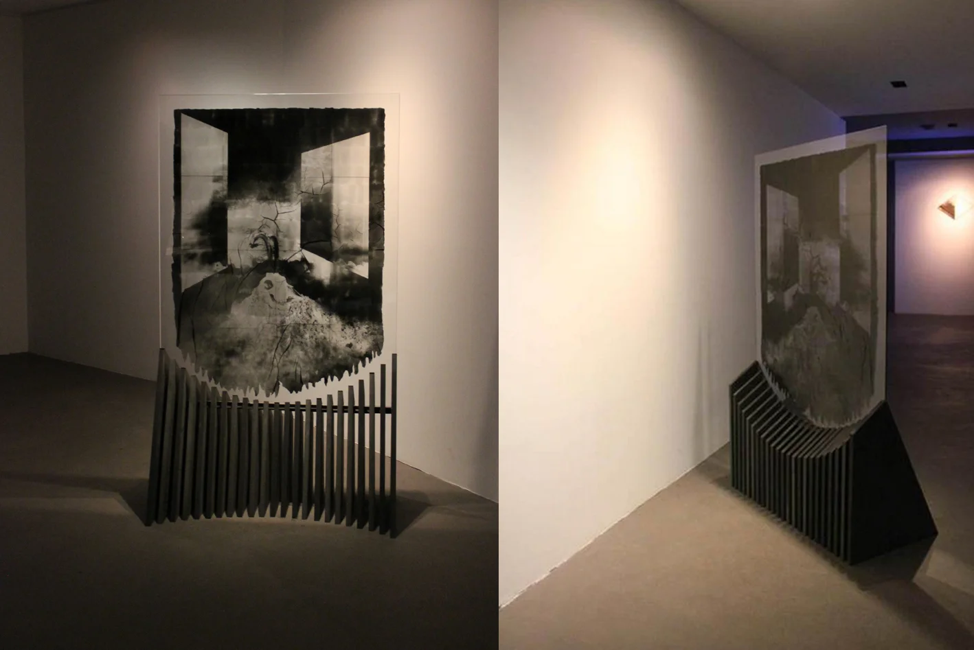 Ce qui compte, c’est la somme de tout cela ; le surgissement de l’image sous sa forme sculpturale, s’adaptant et fusionnant amoureusement avec son support. Ainsi, tels des débris, des sculptures de verre froissé, fondu, encore chaud deviennent des « corps coulants », en suspension.