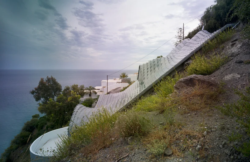 La forme de la maison et sa toiture métallique produisent une ambiguïté esthétique calculée entre artificiel et naturel, entre la peau d'un dragon enfoui dans la terre, quand on la regarde d'en bas et la vision des vagues de la mer quand on regarde d'en haut… – pablo gil and jaime bartolomé, gilbartolomé architects
