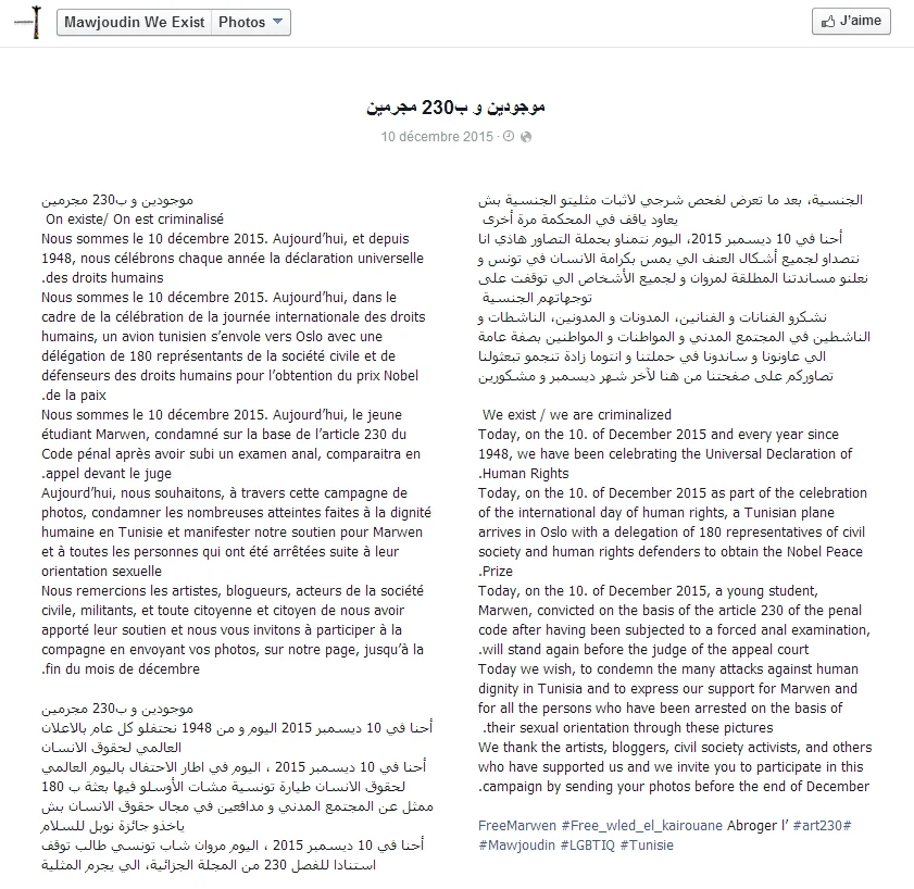 "L'article 230: jusqu'à quand ?": Une cinquantaine de personnalités tunisiennes ont lancé le 10 décembre 2015 une campagne pour l'abrogation de cet article