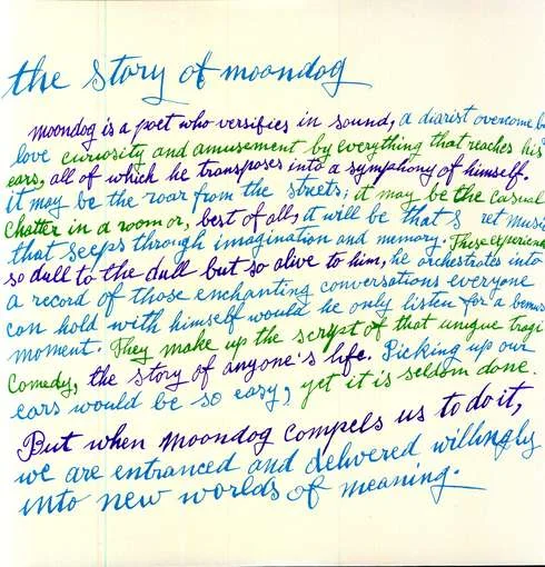 Iconoclaste musicien des rues, sévissant habillé d'un total look viking sur la sixième avenue à New York, ami de Stravinsky et de Charlie Parker, Moondog fut aussi inventeur d’instruments, compositeur tardif, mais inspiré, de madrigaux, et précurseur du minimalisme avec des influences avoués sur Steve Reich et Philip Glass. Moondog (1916-1999) – né Louis Thomas Hardin – était aussi poète. Comme le souligne Marie-Hélène Estève en préambule à sa traduction française de ses 50 Couplets, « il s’agit là d’une poésie orale qui, par fragments jaculatoires, proclame une philosophie ».