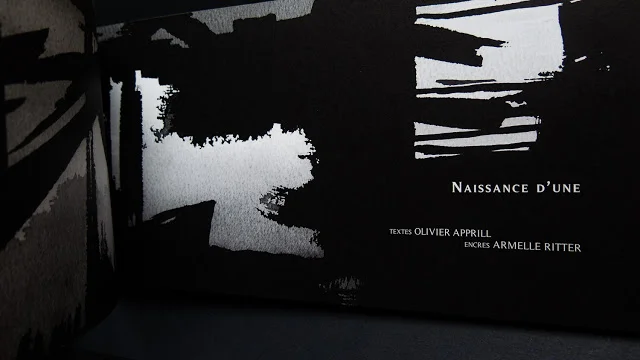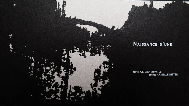 Naissance d'une est une création d'Olivier Apprill (texte) et Armelle Ritter (encres), publiée par les éditions Zinc en 2008. J'ai découvert par hasard ce très beau livre grâce au festival Les Eternels FMR organisé à la Halle Saint-Pierre en décembre dernier par les éditions de L’œil d'or. Le festival, qui propose une librairie temporaire présentant le catalogue d'une soixantaine d'éditeurs peu présents en librairie, en plus de lectures, débats et performances, reviendra à la Halle Saint Pierre du 3 juin au 13 juin 2016. Je vous conseille d'aller y faire un tour (notez), pour découvrir des livres qui sortent des sentiers battus.