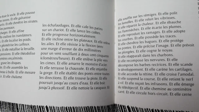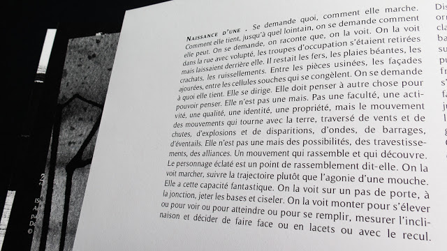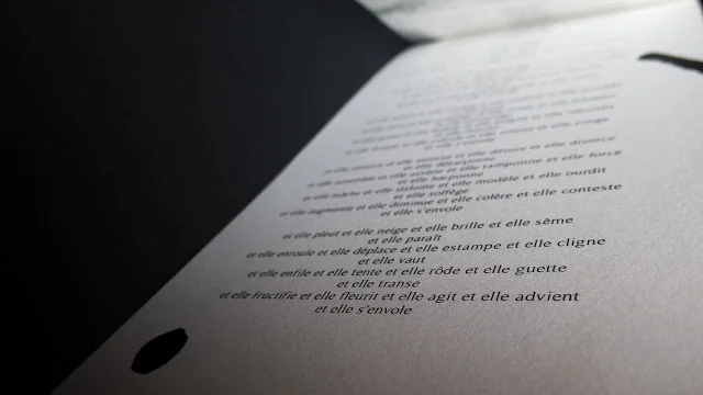 Naissance, dans la marge, entre le texte et l'encre, dans l'entre-deux, la zone frontière entre le noir et le blanc. Naissance d'une, qui est plusieurs, Naissance d'une, qui varie. Incantation : femme, pluie, animale, pensée, point, phrase. Phase. Qui s'étire, voix plastique élastique — voix qui énumère, allitère. Le poème psalmodie et conjugue. Joue avec les mots.