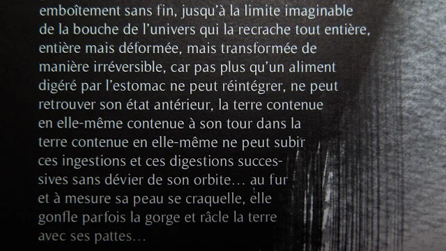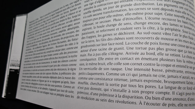 Encres et textes, coulées noires, impressions grises, lumières. Du blanc sur noir au négatif. Les couleurs s'inversent. Le portrait devient paysage et le livre objet, retourné, feuilleté. Format – et impression – à l'italienne. La voix crée, se module, s'altère en un long poème — ou la succession d'une vingtaine. Changement de rythme et de sens.