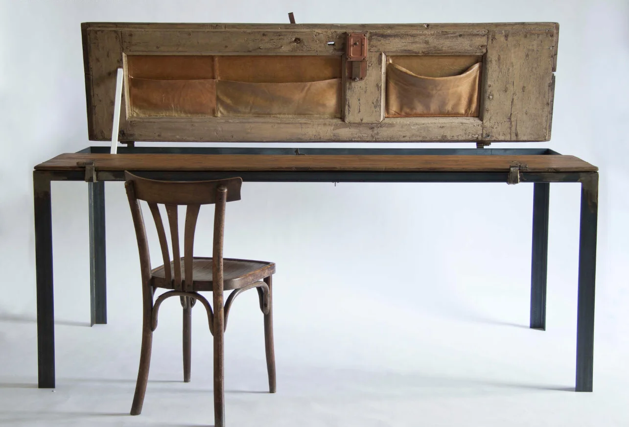 Une simple porte, sciée en deux, devenue bureau pliant, assortie de poches de rangement, d'une lampe: est-ce encore une porte, qui ouvre sur quelque chose, ou déjà - et seulement - un meuble de bureau intelligent? Évidemment, on penche du côté métaphorique de la porte, tellement plus poétique! Les objets, tous uniques, tous sauvés d'un destin d'oubli, des charpentiers poètes de Manoteca, un atelier de Bologne, Italie, cherchent à dépasser leur seule utilité. Ce bureau ingénieux qui pourrait être celui du baron perché d'Italo Svevo n'est pas seulement une idée brillante à répéter : c'est un geste d'amour sentimental et esthétique envers les objets. Pour acquérir les créations/fabrications de Manoteca, vous devrez vous adresser à ceux qui les réalisent. Écrivez-leur.