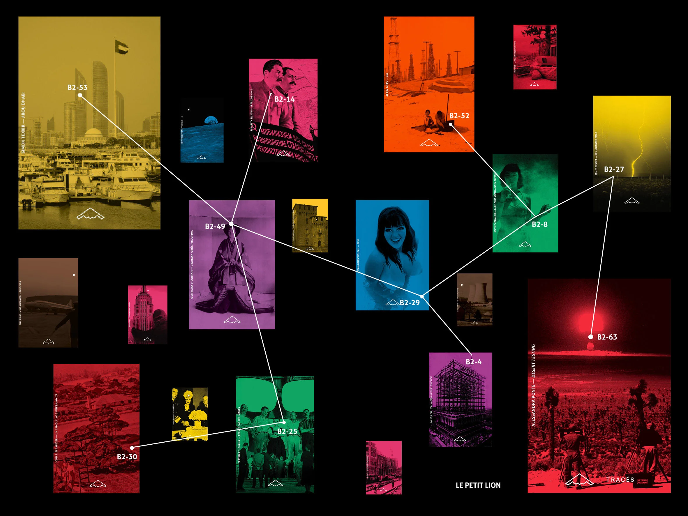 Le petit point en question s’appelle « confetti » et constitue un punctum focal positionné en fonction de ce que « dit » l’image de couverture. C’est un hommage, discret pour certains et beaucoup moins pour d’autres, à la fois à Pierre Faucheux et à ses collections « Point Seuil », et à la fois à Roland Barthes et à ses écrits sur la photographie. Ce n’est que bien plus tard, le catalogue s’étoffant, que le confetti a été appelé à devenir un « connecteur » puis à participer aux « constellations » permettant d’associer, le plus souvent par analogies, plusieurs titres ensemble. Très impliqué dans le projet B2 et l’architecture, je considère Lionel Catelan un peu comme mon « graphiste en chef ». C’est à son initiative que, récemment, nous avons amélioré la grille des pages intérieures afin que sa micro-typographie soit optimale et l’occupation « tout utile » de la page, plus économique.