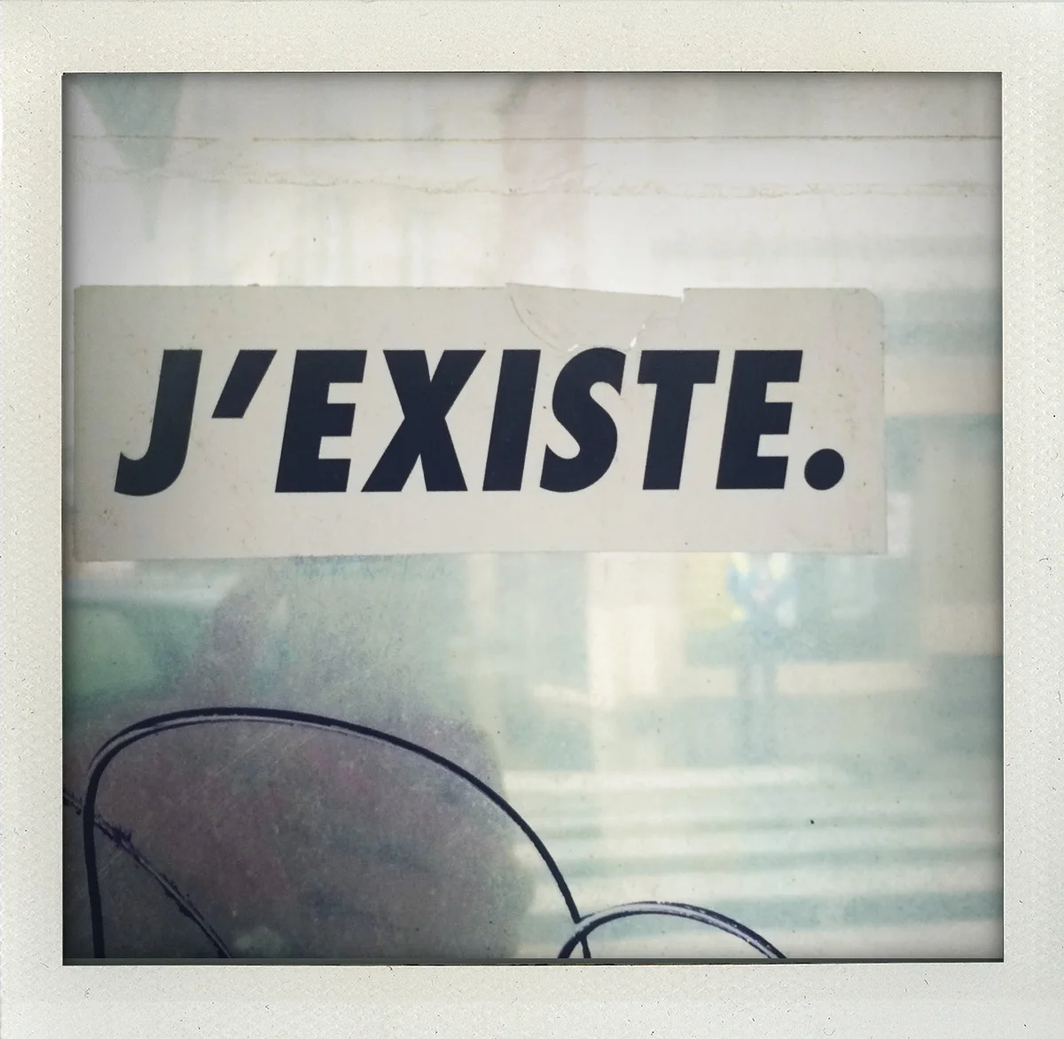sur les murs les portes certains poteaux on peut lire j’existe. écrit au moyen d’un autocollant à la typographie noire sur fond blanc collé à la sauvette en passant marquage d’un territoire définition d’un lieu par une présence répétitive la récurrence du geste de la main qui applique et du message parlant de soi comme de tous de tous à la fois comme soi seul j’existe.