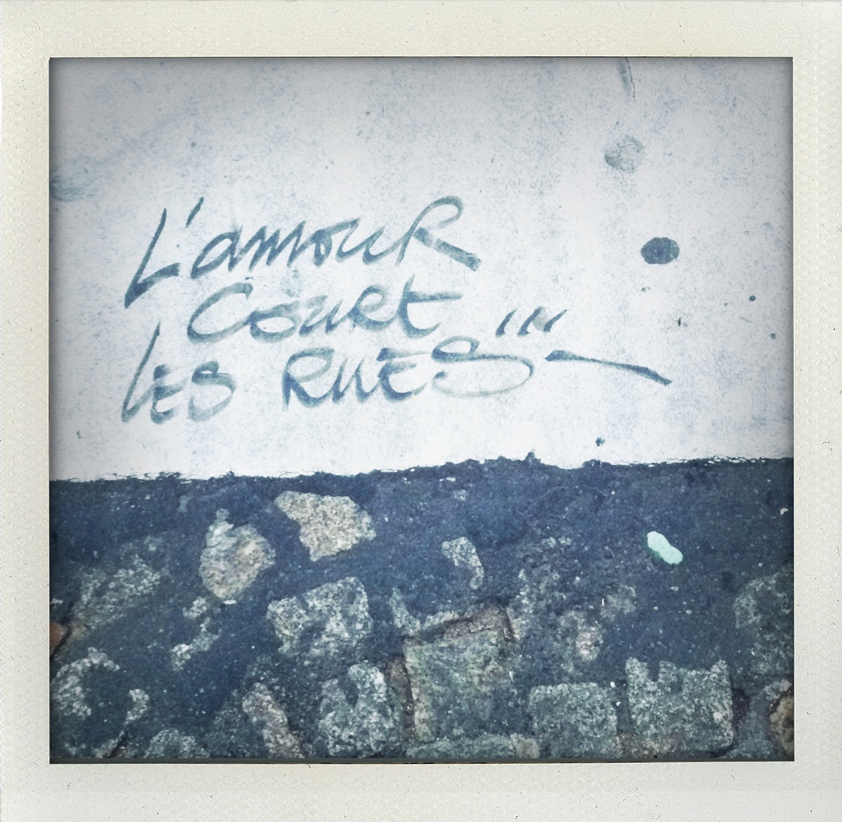 ailleurs au sol sur les bandes blanches des passages piétons s’effaçant à force d’y poser les pieds l’amour court les rues écriture manuscrite marqueur épais et le message de se déplacer de se renouveler quand l’effacement opère au point de ne laisser que deviner la trace grise des mots passés et parfois sur les murs sur les affiches les vitrines abandonnées