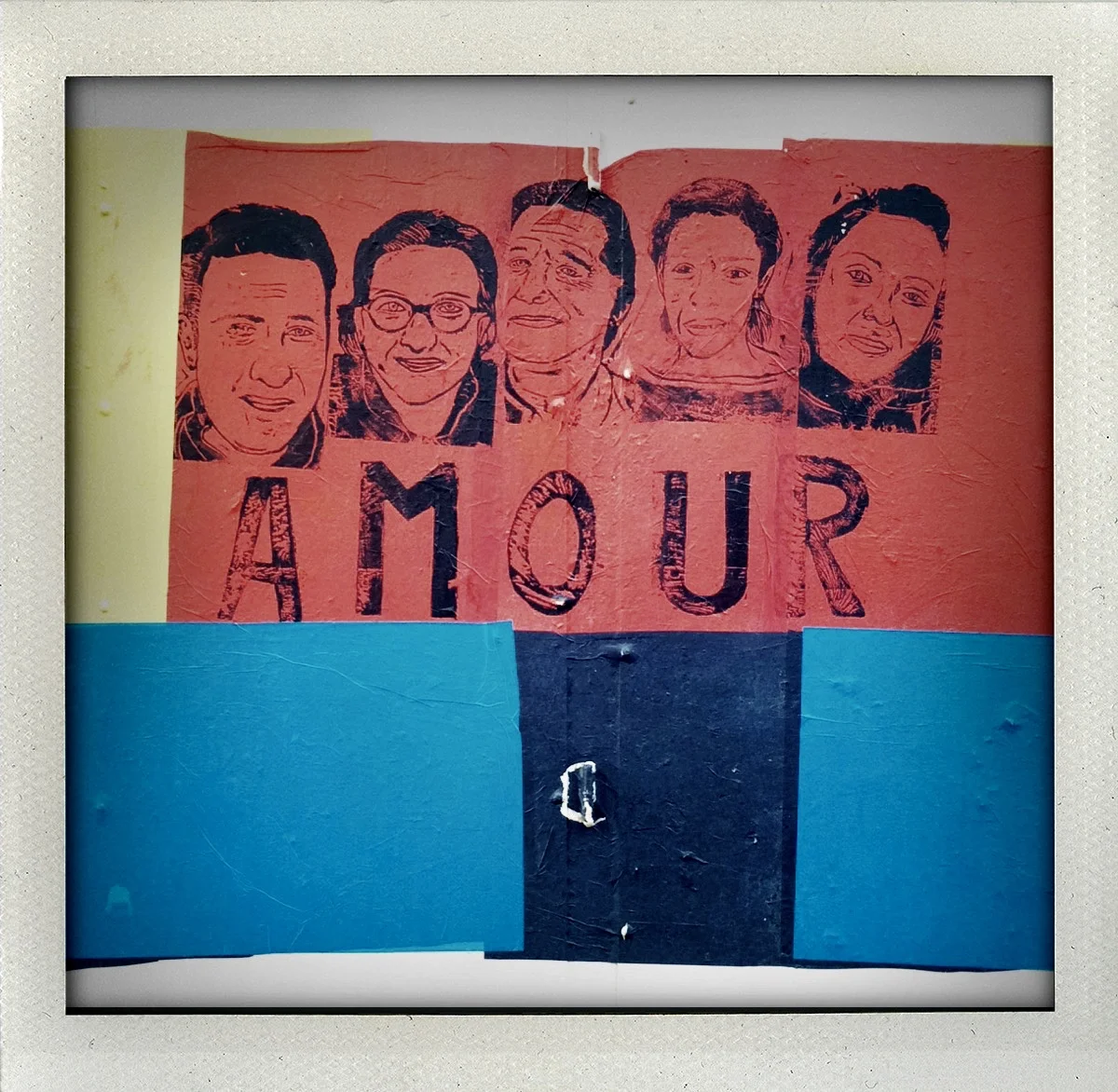 courage amour femmes hommes en rouge et noire autres couleurs sérigraphies placardées dans la ville qui finissent par être au jet d’eau enlevées qu’on recolle après même endroit même mur galerie de portraits on y est c’est moi qui parle nous qui parlons tous au travers de ces mots et rien à vendre rien à faire passer en force juste étendre sur nos maux le rêve d’autres