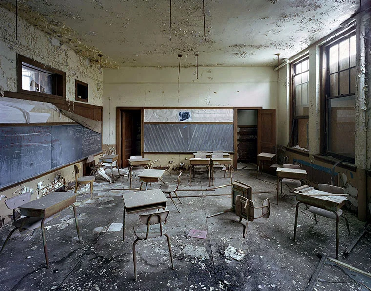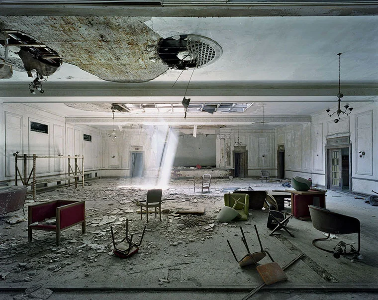 Une question à poser aux deux photographes -, ces photos prises à Detroit à partir de 2005 par deux jeunes photographes français, Yves Marchand et Romain Meffre, nous jettent à la figure la violence extraordinaire qui s'abat sur une société entière (la nôtre, en l'occurrence, avec ses cabinets de dentistes, ses écoles, ses églises, ses hôtels, ses immeubles de bureaux, toutes ces choses qui nous semblent banales, acquises) quand elle se trouve privée de ses moyens d'existence. Il ne s'agit pas, ici, de la disparition de l'Atlantide, du mystère de l'île de Pâques, de l'épuisement de la civilisation qui avait construit de temple d'Angkor, ou de la décadence de l'empire romain, mais tout simplement, maintenant même, de ce qui s'est ensuivi à Detroit, la capitale mondiale de l'automobile, là où s'est inventé le travail à la chaîne, la production industrielle, le mythe américain de la voiture pour tous, après la disparition des grandes usines Ford, Chrysler, General Motors, disloquées par la concurrence.