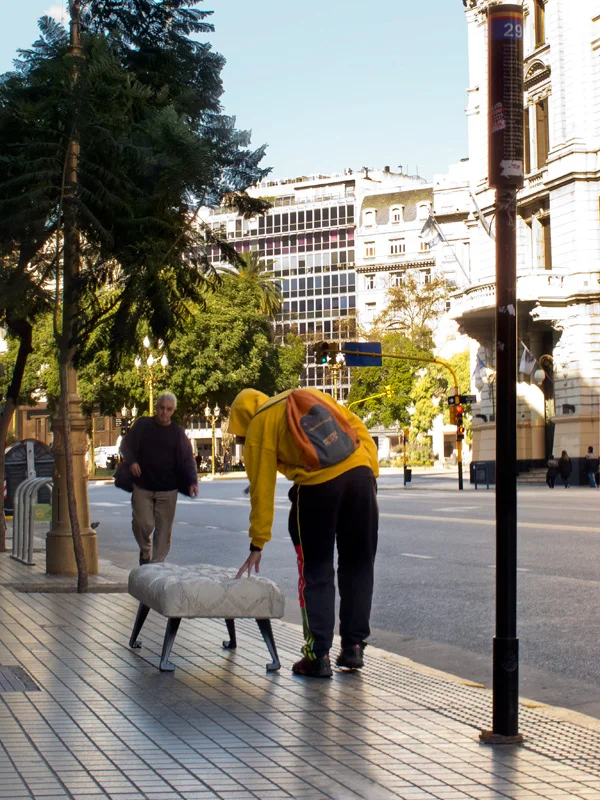 Venus de loin, Buenos Aires, et partis assez loin dans leur tête, aussi, les deux designers dérangés/dérangeants du Grupo Bondi, Ivan Lopez Prystajko et Eugenio Gomez Llambi, proposent une alternative purement poétique, mais pratique aussi, praticable, concrète, on serait tenté de dire, aux sempiternels meubles de parcs et d'espaces publics, qui ont bien intégré les sympathiques chaises rivées au sol sur quelques places, qui intimident les passants, et incitent à peu près autant les passants à s'y asseoir pour lire leur journal qu'une statue d'écrivain donne envie de lire ses livres, mais continuent à manquer terriblement de ce rien d'émotion qui fait battre le coeur, et s'interroger sur ce qui se passe dans la ville, à cet endroit où on est, pour peut-être agir et penser autrement: là, soudain. Cet effet Dolce Vita, se jeter dans la fontaine, s'embrasser sous l'obélisque de la Concorde, s'allonger pour perdre la tête devant un trompe l'oeil baroque. Toutes choses interdites et non, que seule la structure policée de la ville nous dissuade de faire. Exploitant une technologie qui permet d'utiliser autour d'une structure de PVC un ciment qui permet de reproduire les détails les plus fins d'un imprimé, les plis d'une ottomane, le grain d'une tapisserie, le Grupo Bondi sort des salons du dix neuvième siècle et des chambres à coucher ces objets qui personnifient le confort bourgeois, et les mettent à la rue. En espérant qu'ils nous racontent l'histoire de ruptures avec la vie bien établie, le choix de devenir bohèmes, la possibilité, peut-être, de tirer quelque chose de bon du déclassement qui guette avec la crise, qu'a connue bien avant nous Buenos Aires, qui fut la ville la plus riche du monde dans les deux premières décennies du vingtième siècle. Ces deux designers espiègles et romantiques ont toujours eu cette démarche: comme avec leurs Trichaises, ces chaises de récupération vendues par trois, dégénérées comme les hommes à force de se reproduire entre elles, critique drôle et mordante de la production en série, ou leurs ours en peluche en ciment, rejetés comme une enfance oubliée, et survivant.