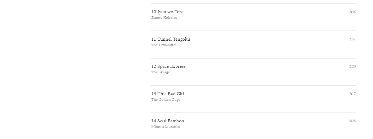 Par ailleurs, avant de loucher vers le krautrock ( planant allemand des 70’s) le pays du Soleil levant tente des hybrides folk en mixant bouddhisme et rock ou jazz à bambou avec People et Minoru Muraoka ou partent à la recherche d’un son aussi tribal que psychédélique avec Akira Ishikawa & Count Buffalos. On note une tentative soul avec Love Live Life + One et des iconoclastes qui font autant de musique de films que d’albums perso, comme J.A. Caesar dans un élan classique, avant de terminer par un seul exemple de la scène free jazz. Il aurait fallu parler de Keiji Haino, mais nous avons sélectionné Toshiyuki Miyama and his new herd Masahiko Sato.