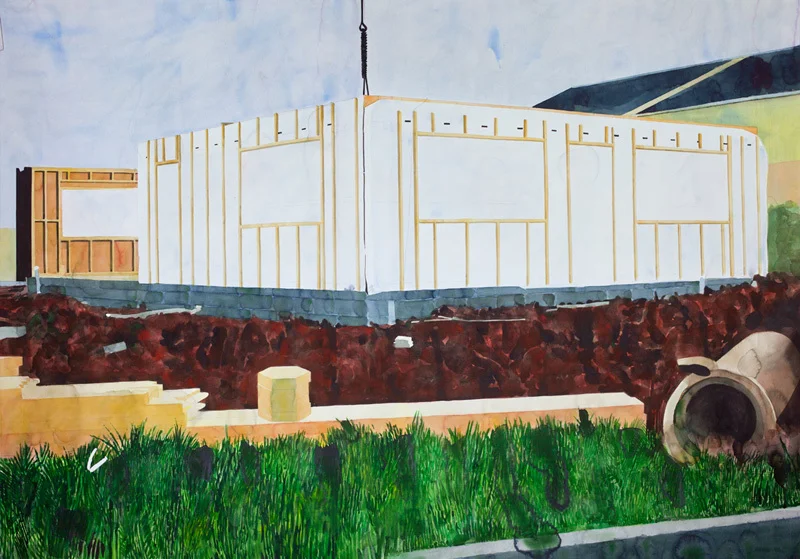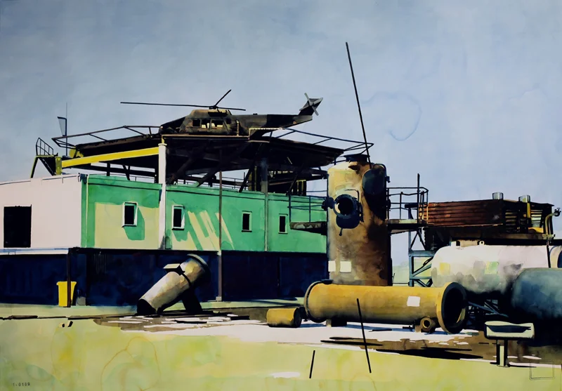 Ses aquarelles sont documentées par des photographies de repérage effectuées par l’artiste au cours de ses explorations et nourries en parallèle par nombre d’images de provenance très diverse (histoire de l’art, planches anatomiques, catalogues, calendriers, affiches, plans…). Docks, zones portuaires, lieux d’activité, d’échange, de passage et de transit, sont les sujets de prédilection de Salomone qui les compose et les monte à la surface du papier jusqu’à ce que l’image obtenue vienne cristalliser un moment, un paysage.