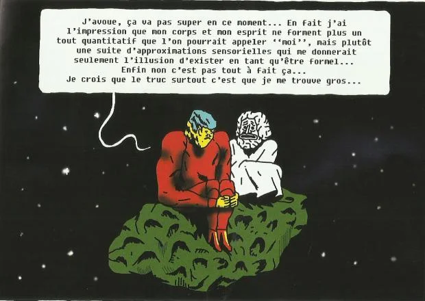 Dans les mots, avec les situations, ou l’apparence de personnages (coincés quelque part entre figures de la Grèce antique, zombies déformés et allégories issues d’un cauchemar), Marchalot casse tous les codes, tisse des guirlandes de maladresses et joue avec la langue comme un enfant de 5 ans. Puis, il invente un style nourri d’abstraction formelle : kitsch, numérique, en noir et blanc ou au lavis dégoulinant, son visuel déconstruit fascine par son refus de plaire. Une manière de jouer la surenchère absurde pour mieux torpiller la bêtise ambiante et parodier notre monde policé.