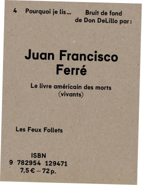 C’est avec Frank Smith et son « Fonctions Bartleby, bref traité d’investigations poétiques » que j’ai découvert l’an dernier cette curieuse et précieuse collection « Les Feux Follets », aux éditions Le Feu Sacré, au format miniature, consacrée à de stimulants essais, eux-mêmes poésie en action ou quasiment, d’auteurs à propos d’autres auteurs. Publié en octobre 2016, « Le livre américain des morts (vivants) » offre la formidable analyse que conduit Juan Francisco Ferré à propos du « Bruit de fond » (1985) de Don DeLillo, et partant, d’une bonne partie de son œuvre, car si la part du lion, parmi ces 70 pages d’une belle intensité, revient bien à ce « White Noise » aux échos par ailleurs si gibsoniens, il y est aussi abondamment question de « L’étoile de Ratner » (1976), de « Joueurs » (1977), des « Noms » (1982), de « Libra » (1988) ou de « Cosmopolis » (2003), et, dans une moindre mesure, de « Chien galeux » (1978), de « Mao II » (1991) ou d’ « Outremonde » (1997).
