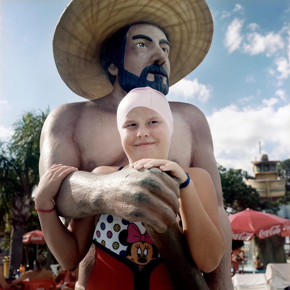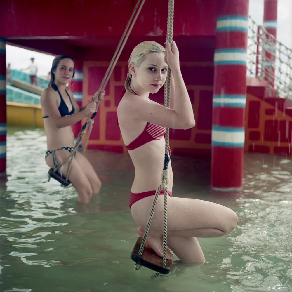 Dans ce petit monde aquatique, gardé du monde extérieur par des dinosaures et autres créatures fantastiques, il m'est permis d'échapper à certaines de mes inhibitions. Nous avons des univers intérieurs qui se dévoilent quand nous ne sommes pas sur nos gardes. Quand je prends quelqu'un en photo, je l'encourage à dépasser sa timidité. Cette confrontation me fascine, car je suis également en maillot de bain et que la tension qui en résulte est palpable , tous deux étant aussi nus que vulnérables. La dynamique de ce petit monde est emplie d'interactions humaines, la plupart, quand y regarde de près, n'étant pas très sérieuses au demeurant.
