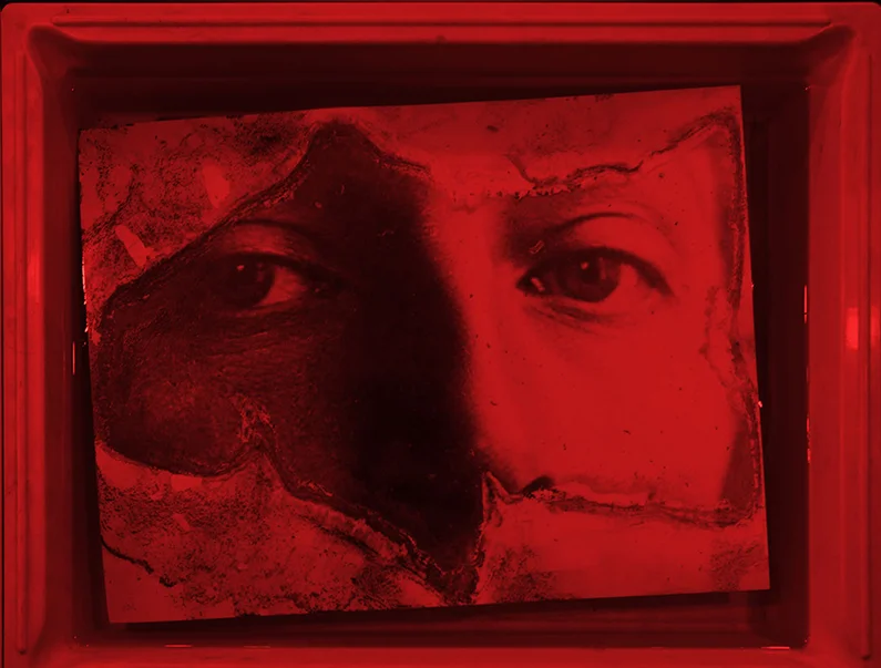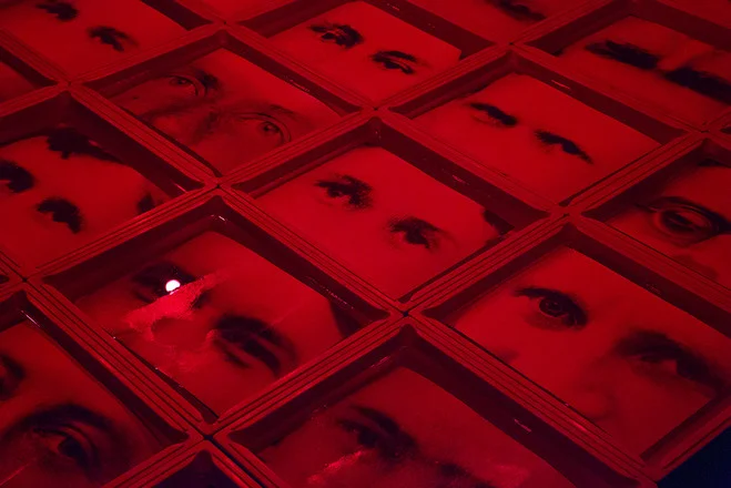 Deux installations sont ensuite plongées dans le noir. Avec À la recherche de Stella, projection de 300 visages de femmes, le visiteur est invité à les capter à l’aide d’un miroir fourni et à les faire apparaître sur le mur, le sol, le plafond… Selon la direction qu’il ordonne en parcourant l’espace à sa guise, il révèle ce qui lui restait invisible sans son acte. Plus loin, est déployée l’installation Le Regard des morts, composée de plusieurs centaines de bacs contenant autant de photographies immergées dans l’eau, non fixées et menaçant de disparaître sous la lumière rouge inactinique. Ces photographies de visages d’hommes aux yeux grands ouverts renvoient à cette incertitude, cette indécise ligne de partage tout juste expérimentée. Ces œuvres nous font ainsi passer de l’autre côté de l’image et du miroir, par leur fragilité même qui ne manque pas de résonner en chacun de nous.