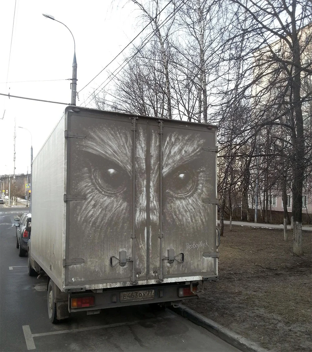 Depuis quelques semaines, et avant le printemps pour profiter des traces de l'hiver, l'illustrateur et artiste de rue moscovite Nikita Golubev a parcouru la capitale russe pour "graver" les voitures d'images de figures animales. Que voici…