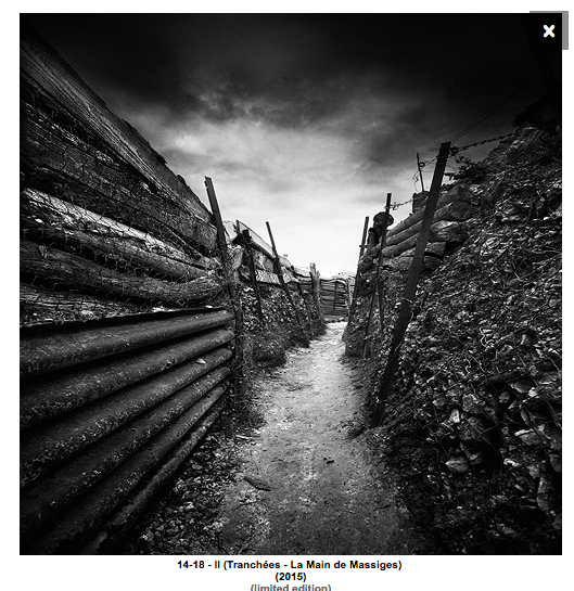 A travers 14-18 la grande Guerre, Bruno Mercier revient à ce combat; il évoque déjà la mémoire de ses arrière-grand-pères disparus au « champ d’honneur », mémoire liée à d’anciennes photographies. Il se lance ensuite dans une sorte de vérification in situ, sur les traces mêmes encore visibles des paysages où se tint la boucherie générale des affrontements et sur les cicatrices des paysages qui ont vu les grandes batailles. Travail en noir et blanc d’une belle intensité dramatique, formellement assumé, cadrage, grain, ciel, importance des variations entre l’ombre et la lumière, de la richesse des nuances de gris,les traces sont encore présentes, que ce soit les bâtiments et blockhaus affleurants, ou le creux d’un chemin, les tranchées elles même. Au delà des films qui, avec d’autres moyens, évoquent le grand charnier, ce retour sur les lieux constitue en soi un paysage de la mémoire, où, ce passé invisible souffle toujours son défaut de représentativité et son excès, plus volontiers matière fictionnée du cinéma de Kubrick ou de Jeunet. A la fuite de l’image, on sent que le photographe cherche cette part d’invisible qui fuit devant lui, qu’une quête s’est constituée et qu’un chemin s’est ouvert, à la fois dans la précision de l’évocation et la volonté d’établir, volonté d’un surgissement voué à réparer cette mémoire personnelle et historique qui est le sujet général du Festival, en portant aux yeux de tous, ce qui toujours, semble ancré, au fond de soi contre la fuite des perspectives grises et mélancoliques, des lieux qui gisent, a rebours de la mémoire,sous le ciel de France et qui emportent le photographe…
