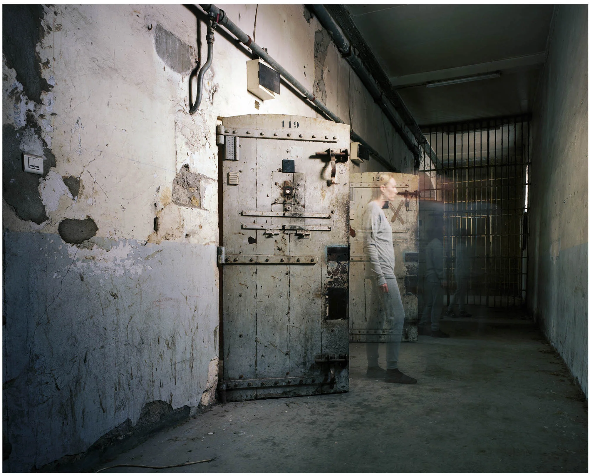 Une même attraction pour les lieux vides en déshérence introduit un univers fantomatique et sert de point de départ aux mises en scène de la photographe. Certains ont osé un comparatif au surréalisme, mais le statut des images n’est pas lié directement à l’onirisme ou au hasard objectif. Il existe chez Estelle Lagarde un parti pris inconscient organisateur de ses séries. Une séduction des lieux qui surgit hors du temps précédant leurs destructions. Séduction visuelle et sensible des lieux à l ‘abandon mais encore accordés à ce qu’ils furent. Ainsi en va t il de la maison d’arrêt d’Avignon, fermée depuis quelques années, cadre de la série « Maison d’arrêt ». Estelle Lagarde recompose, par ses poses longues, le jeu de la présence / absence, introduit un différé où les corps se dissolvent par la magie de la photographie. Serait ce la marque appelant au delà du visible les voix chères qui se sont tues, prenant en épissure le prétexte fictionnel pour revenir au songe d’un champ fertile de l’intime?