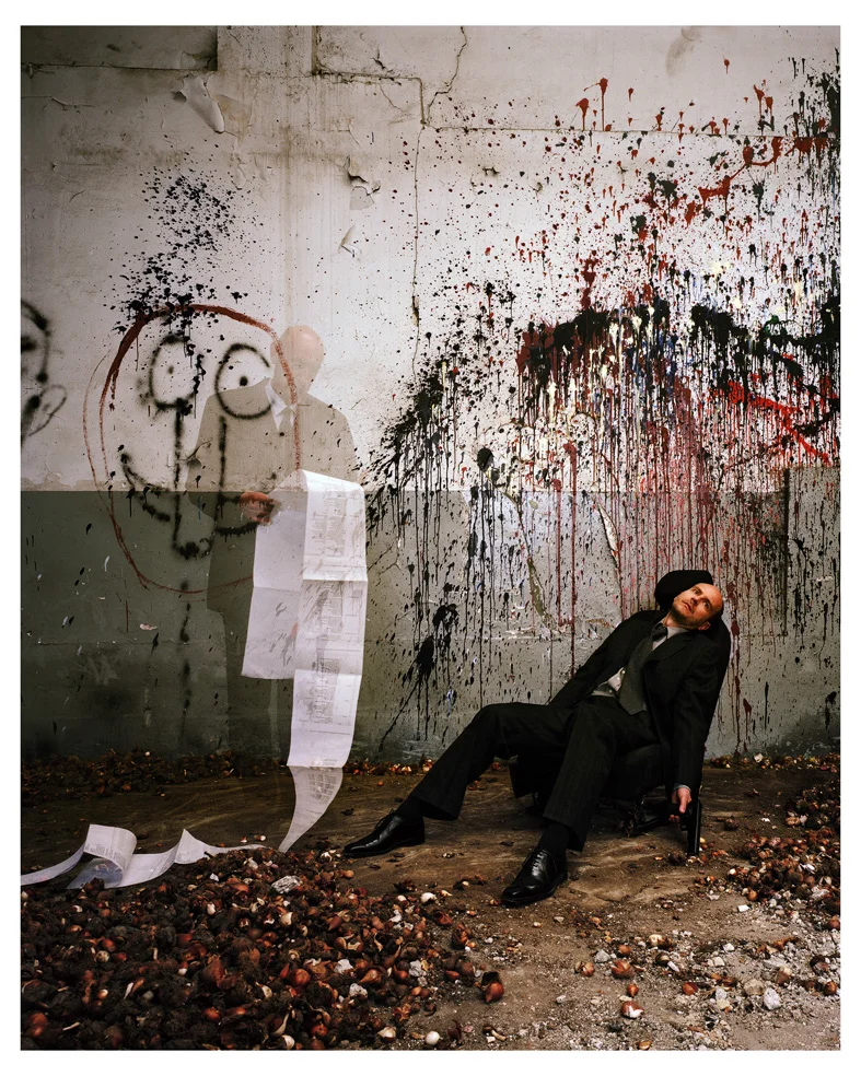 Estelle Lagarde recompose les codes de cette photographie en projetant l’intrusion des matières au sol, envahissantes, rebuts d’une activité disparue, et dans au moins un tiers de l’exposition, fait exploser les taches de peinture, qui envahissent le plan, un peu du Pop Art et de l’Action Painting pénètre avec dégâts la photographie, qui devient plus présente. Les conjugaisons des trois occurrences qui nourrissent la réalisation de la prise d’images, comme on pourrait écrire la prise de sons, provoquent une perturbation de leur lecture, une inflexion vers une certaine modernité. En effet sont conjugués la prééminence du personnage net, la transparence des autres personnages et le traitement en silhouettes diaphanes, l’envahissement des rebuts au sol et la parfaite maitrise de la lumière donnant aux murs, aux fonds, la précision des lieux tels qu’ils sont aujourd’hui, sales, tachés, graffés, enfin, la mise en situation des personnages dans des gestes et situations liées à une photographie documentaire ou sociale, voire issue du Corporate dans la citation de ces situations. envie d’ iconoclastie subversive…