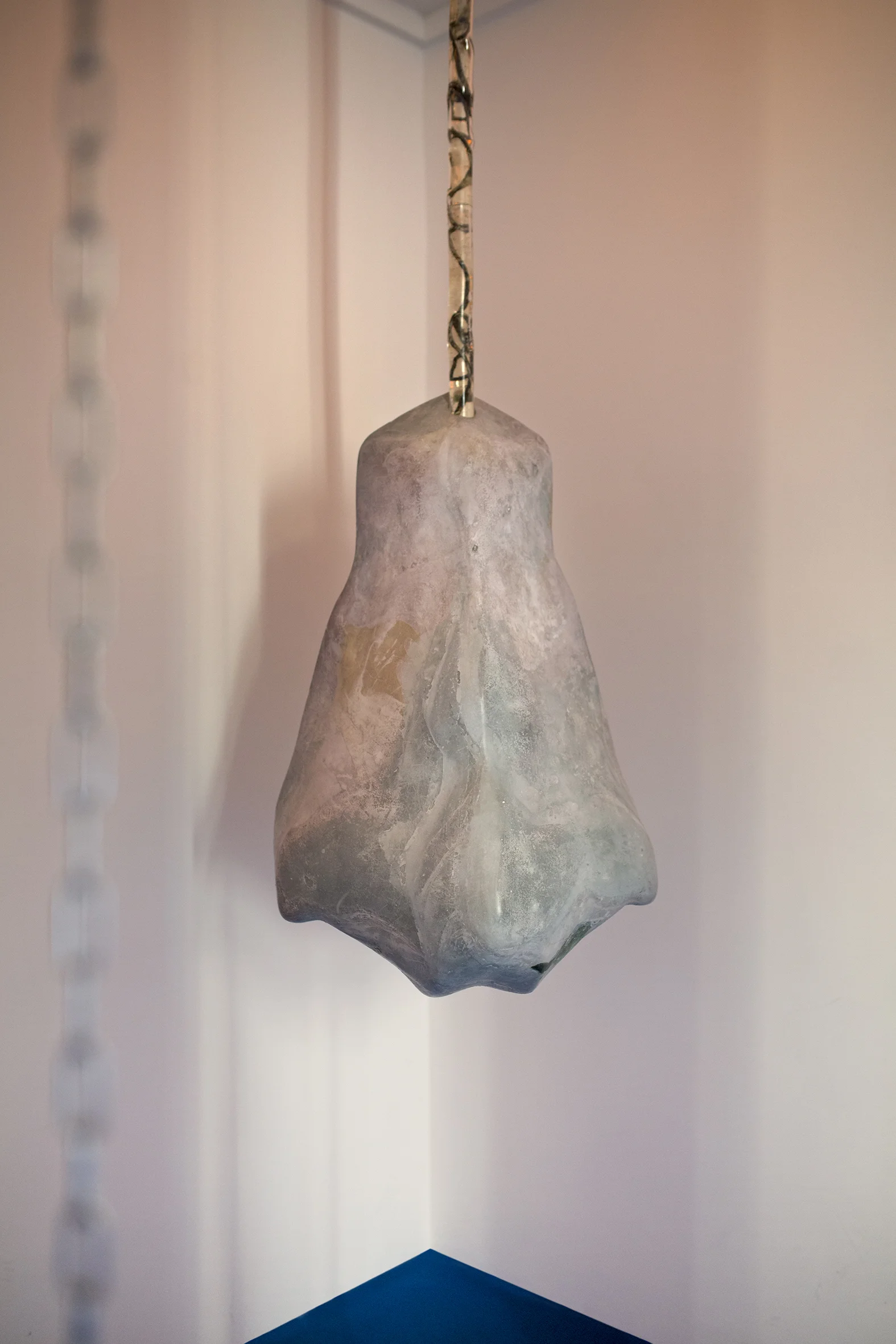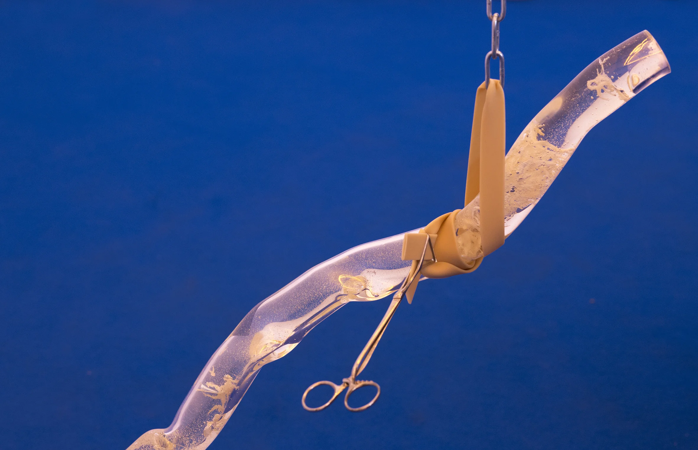 Autour des ces sculptures cinq tubes sont suspendus au plafond par des garrots en latex (Inner chains, 2017). Leur mouvement est littéralement inscrit en puissance dans les plis des tubes. Le plis leur donne vie : Inner chains est un pli devenu matière. Cet ensemble informe et vaguement arboriforme ne dessine pas dans l’espace de la galerie une forme précise, comme c’est le cas pour une autre grappe de trois tubes au milieu de la pièce, disposée comme un obstacle dans un espace qu’on traverse ainsi.