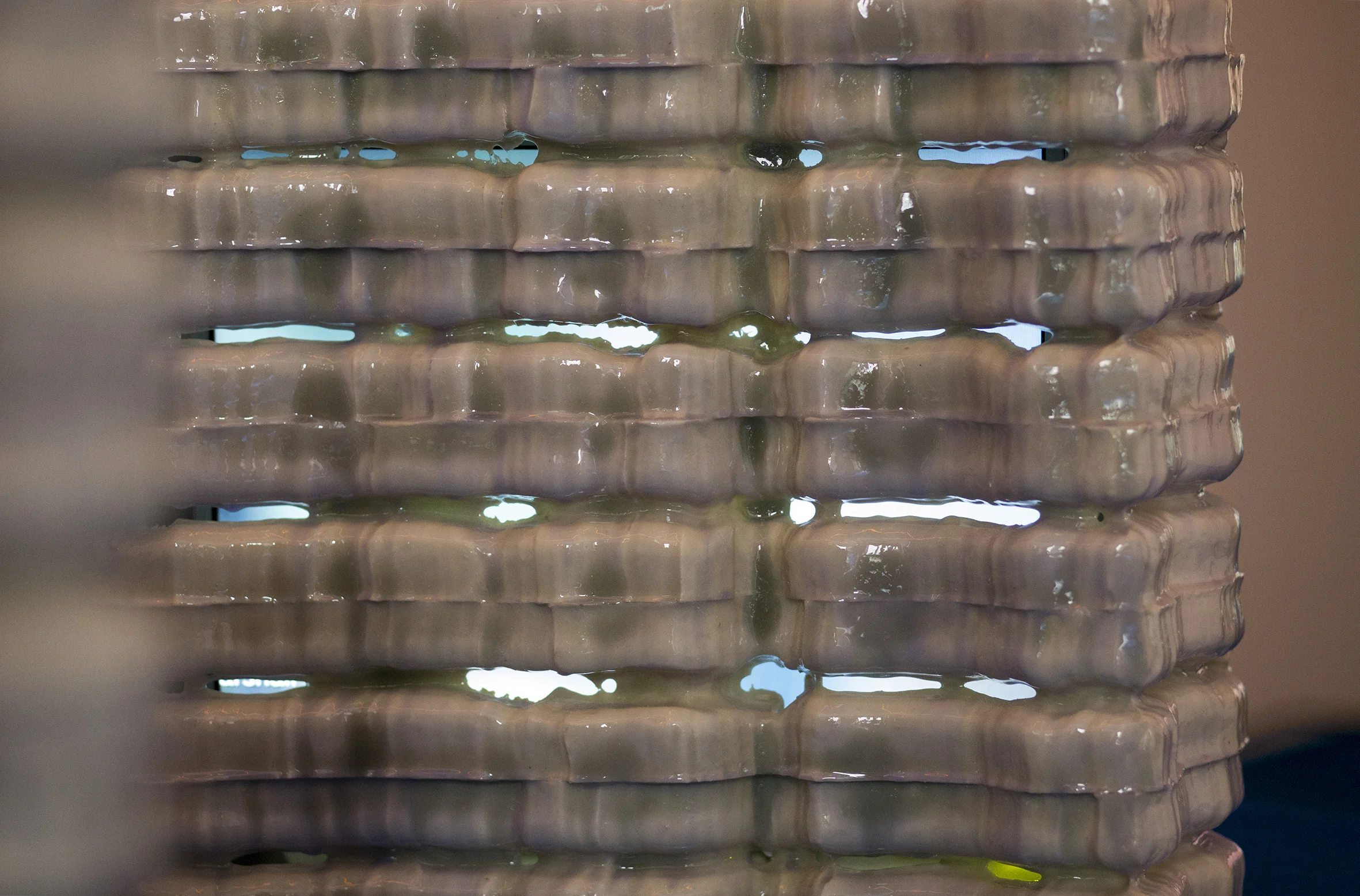 Le corps n’est pas absent non plus d'Inner chains : à l’intérieur des tubes, des formes organiques flottent comme dans de l’ambre. Des poulpes lyophilisées, des racines de ginseng, des vessies natatoires se mélangent à des câbles USB, nouveaux déchets de l’anthropocène. Des objets disparates, à l’instar de fossiles dans une stratification géologique ou, pour employer une image de l’artiste, comme des déchets transportés par la mer sur un marigot, sur une étendue d’eau fermée.