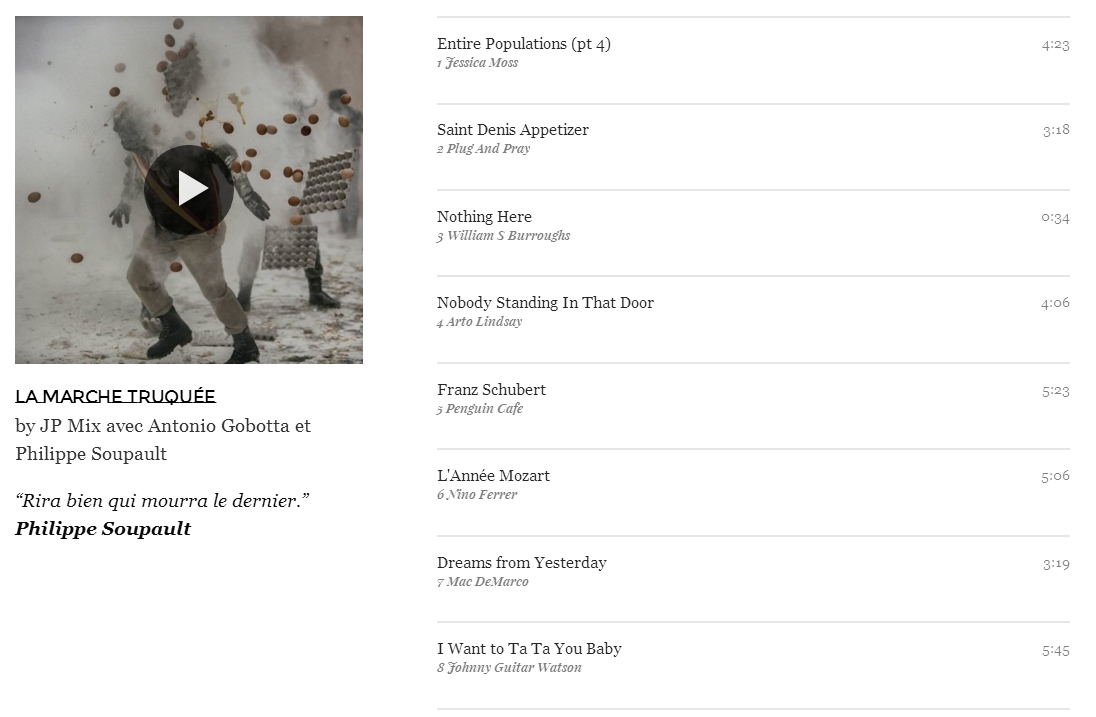 La marche truquée, playlist de la semaine MUSIQUEL'Autre QuotidienJanuary 12, 2018La Marche Truquée, Jean-Pierre Simard Facebook0 Twitter Tumblr Pinterest0 0 Likes