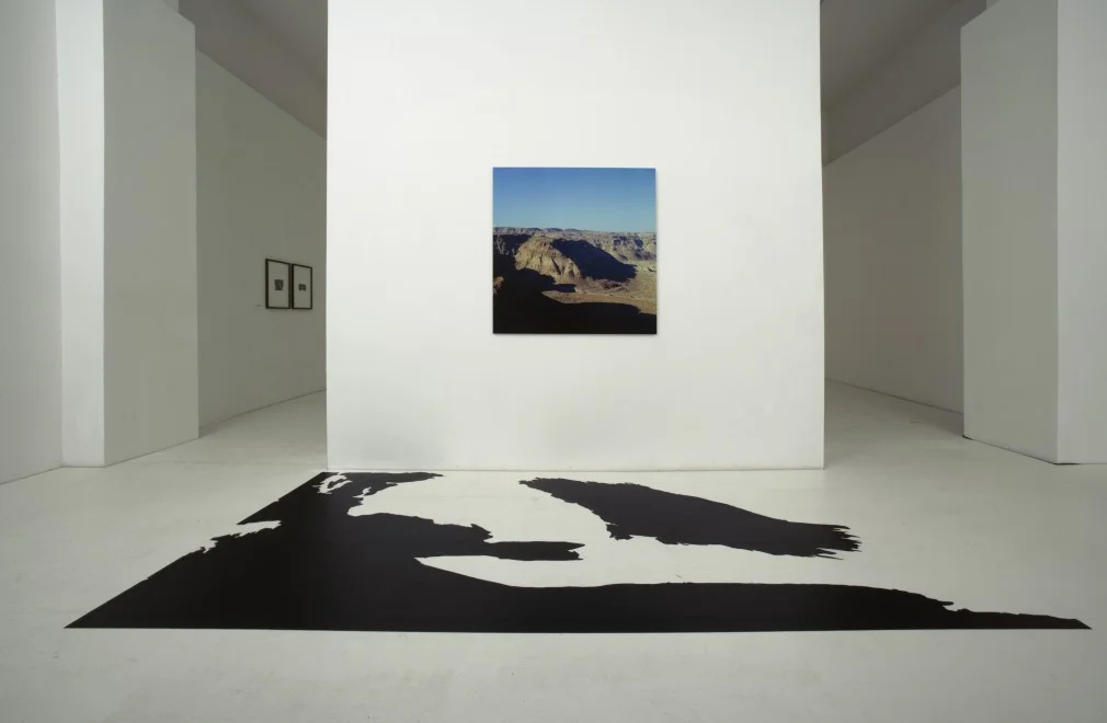 Vera Röhm, Masada avec ombre, 1977 - 2006, installation, photographie contrecollée sur aluminium, 125 x 125 cm et sur le sol: ombre, découpage en feutre, 200 x 395 cm, exposition « Flowing Times », Cologne 2007. Courtesy de l’artiste. - Topographie de l'Art