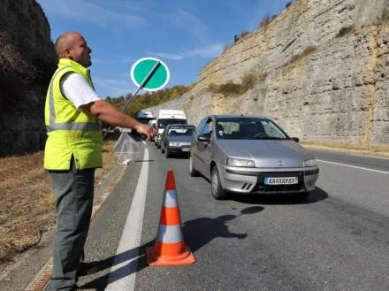 Bien qu’il ait plus de cent personnes à ses ordres, cet homme semble calme et posé. Puis il tourne le panneau rouge qu’il tient et c’est à notre file de voitures de passer devant le chantier.