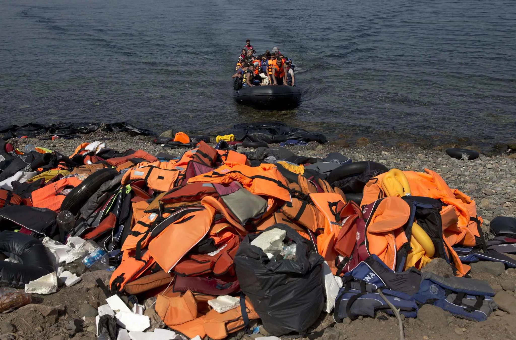 Le 10 septembre 2015, des migrants arrivent sur l'île de Lesbos (Grèce), où ceux qui les ont précédé ont entassé leurs gilets de sauvetage sur la plage après leur traversée. AP Photo/Petros Giannakouris - Petros Giannakouris/AP/SIPA