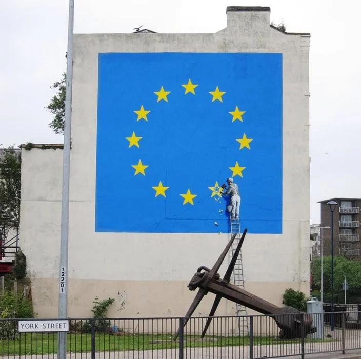 Banksy vient de faire sa première intervention officielle quant au départ de l'Angleterre de l'Europe avec un mural sur une rue de Douvres, à proximité du terminal des ferries. Là même où se connectent Europe et Grande Bretagne.