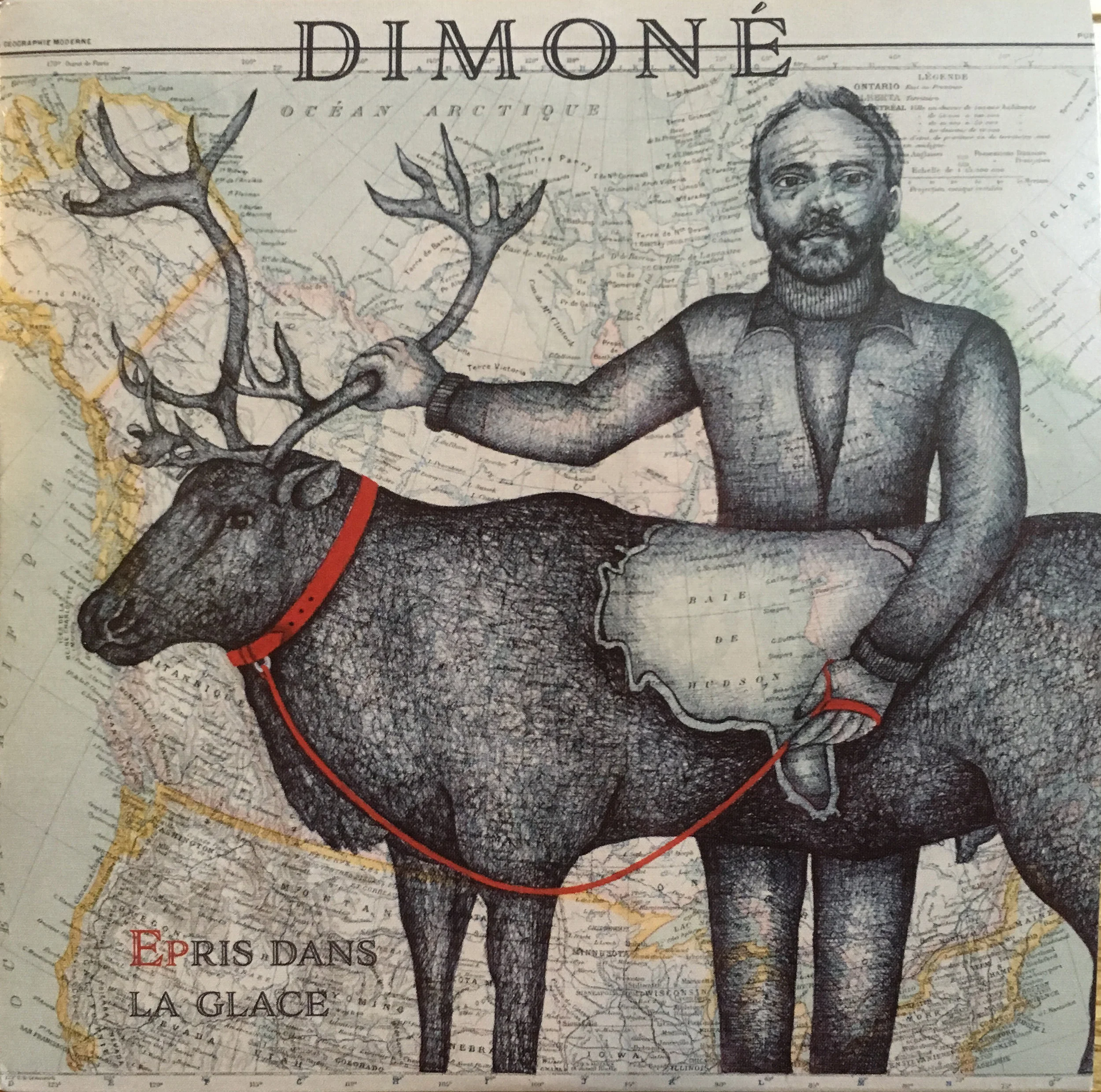 Cette rencontre visuel avec Laurent Martinez aux sculptures bio-mécaniques questionnant notre rapport aux machines ou le contraire, avec O’Malley aux collages de papiers peint de corps rafistolés et impromptus et enfin avec Clara Castagné (qui signe l’illustration de son nouvel EP « Épris dans la glace ») aux cartographies anciennes dont les corps ronds définissent les frontières et les limites des continents tout en les réinventant et en les figurant de fulgurances permet à l’univers musical de Dimoné d’amplifier sa narration musicale.