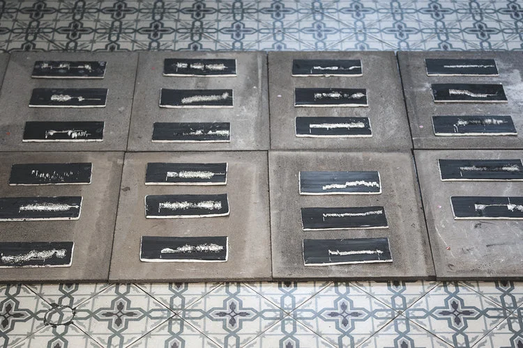 En face de l'instrument sont alignées des plaques en pierre de lave qui, tel un calendrier d'un autre temps, accueillent jour après jour les trente tablettes en porcelaine, "Filaments solaires". Pièces uniques, symboles du passage de temps, ces empreintes, témoins du battement de coeur de l'astre, remplissent graduellement l'espace de la galerie. Il y a ici écriture, celle de la mémoire de notre temps, figer, dompter le temps qui passe, mais aussi celle de l'imaginaire, une allégorie ancestrale, sortir de la grotte et se rapprocher de la lumière qui donne vie...