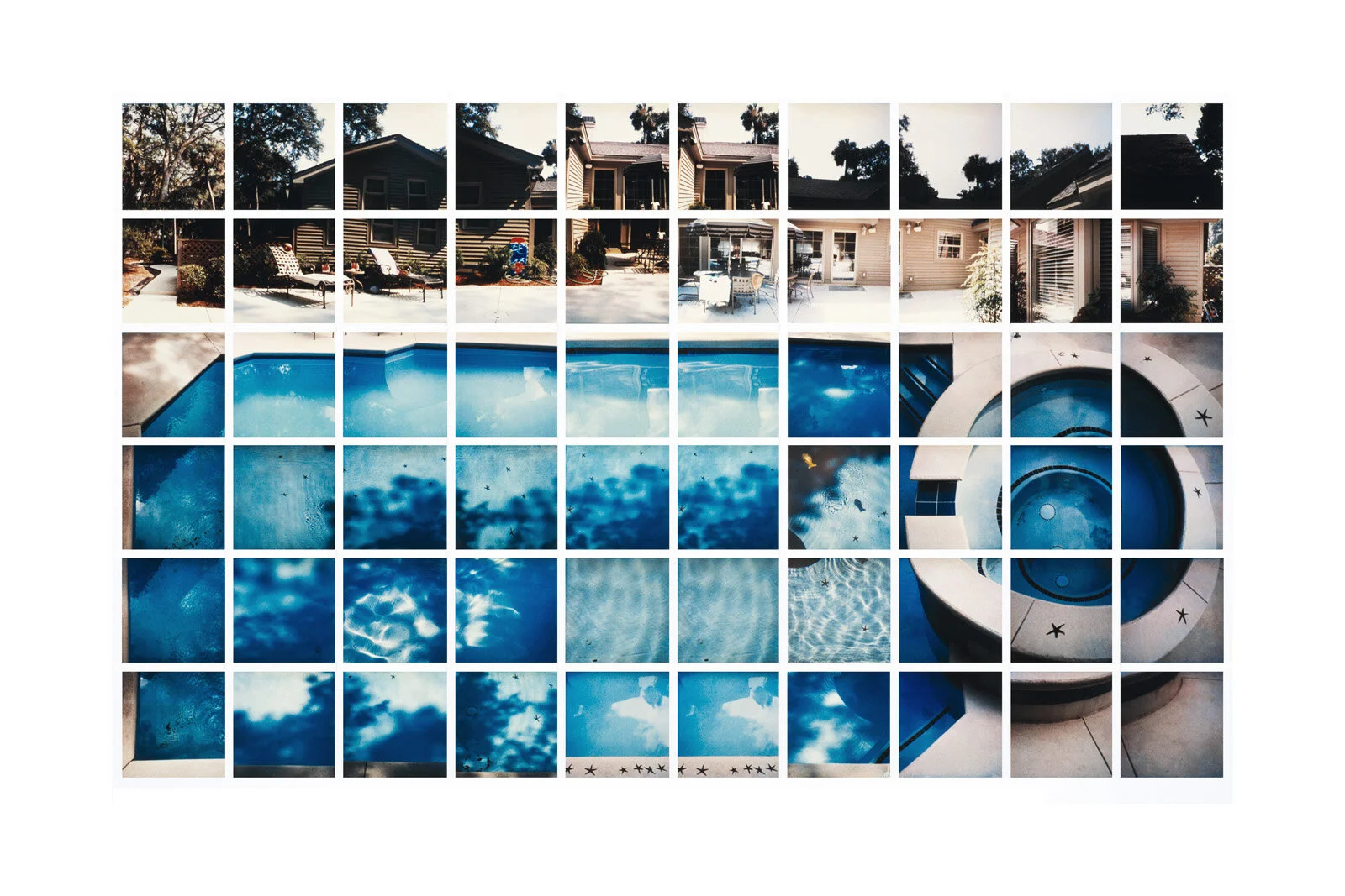 Pascal Therme a appliqué le même procédé en utilisant des films inversibles Ekta. La prise de vue se fait ici en aveugle, et cette fois rectangle par rectangle, sans que le photographe puisse savoir si ce qui a été photographié est conforme à ce qui a été vu. Ce n’est qu’à la fin, au résultat final, qu’il est possible de voir si tous les éléments sont présents pour le montage. Cet acte photographique relève d’une performance artistique où le photographe se risque, dans une manœuvre unique, à capter la globalité d’un espace visible dans un rapport tactile et intuitif et dans une anticipation constante d’un résultat escompté. Le fait d’utiliser un film inversible est, d’une certaine façon, en continuité avec l’utilisation du film polaroid, puisque tout comme lui il enregistre la lumière dans son émulsion directement en positif, sans inversion de valeurs comme c’est le cas avec le négatif. La photographie est ici un « art de faire» avec une matière pour composer les éléments disjoints d’un collage qui les réassemblera en une œuvre unique. Montrer tous les floutés, les nets, les circulations de lumière en arcs de cercle, les répétitions, concevoir un instant T recomposé en assemblant des moments dissociés, saisis par séquences, et élargir l’espace dans des débords qui touchent à la fiction crée l’artefact d’un cubisme photographique par les collisions engendrées entre les différents éléments spatio-temporels. C’est un voyage « devant le temps », une échappée hors de la linéarité temporelle et du continuum spatial, une mise à l’épreuve des espace-temps subjectifs tels que chacun les construit pour « être » au monde.