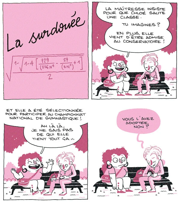 Cette BD envoie en l’air une galerie de caricatures, autant dans l’esprit que le trait, qui, si elles n’évitent pas les poncifs, transcendent avec talent le genre, en ne craignant jamais les blagues scabreuses qui remettent en question le politiquement correct du moment et flirtent avec le plus parfait mauvais goût comme pour mieux déconstruire les clichés qu’on voudrait nous faire subir comme image de la normalité actuelle ( ventre-mou et cadre sup qui votent micron… ) : de la famille homo-parentale qui se dispute le rôle du meilleur papa, à la mère indigne qui ne veut pas récupérer son enfant chez la nounou, via le fils quinqua toujours en prise avec sa mère abusive. Vous découvrirez le reste vous-même…