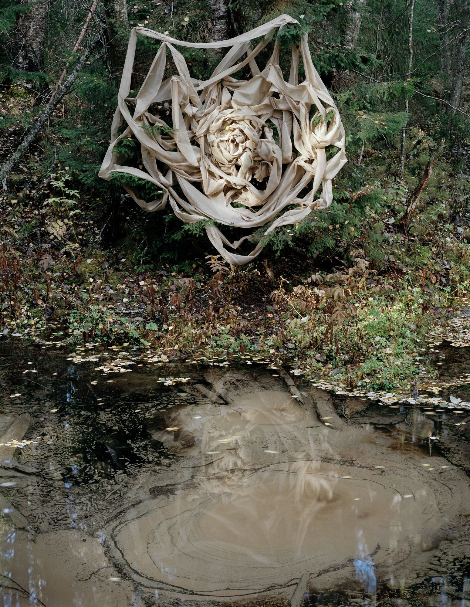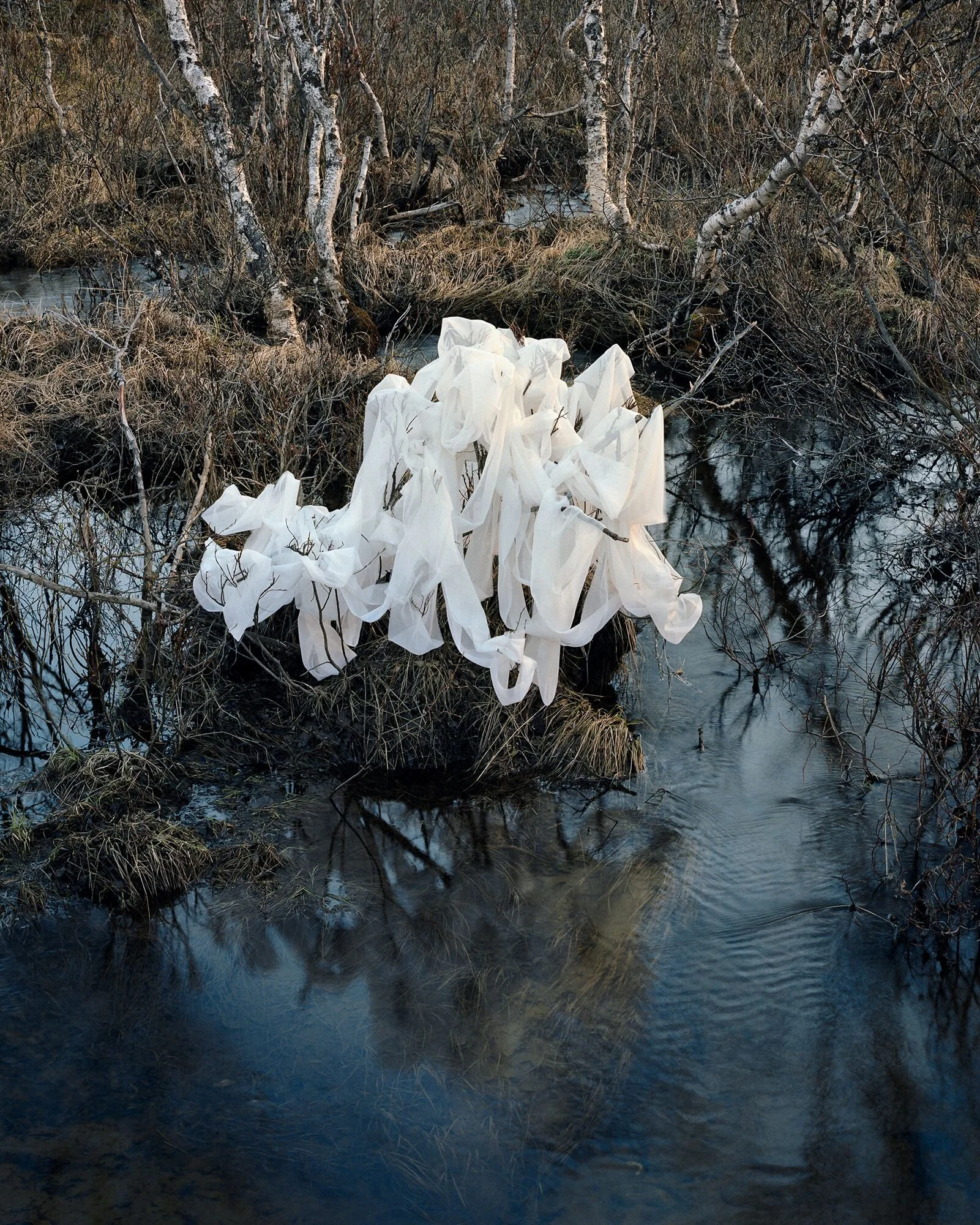 Dans mes photographies, il n'y a pas de paysages avec des points de repère géographiques ou artificiels. Je m'intéresse au contraire ; aux lieux silencieux qui sont abandonnés, isolés, inhabités. Mon souhait est de les mettre en avant, de leur donner une voix. Patauger dans les rivières, les ruisseaux et les zones inondées permet d'observer depuis des perspectives inhabituelles. Pour moi, l'eau représente les mirages de nos rêves, de nos souvenirs et de notre subconscient. Combinés aux rubans, les résultats sont des énigmes qui attirent le spectateur plus loin dans les images.