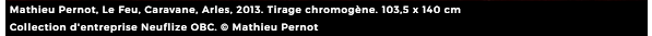 Quant à Mathieu Pernot, qui documente depuis vingt-cinq ans le quotidien des tziganes en Europe, sa photographie Le Feu, caravane (2013) d’un camping-car embrasé témoigne d’un rituel pratiqué chez les Roms qui consiste à faire brûler la caravane d’un défunt.