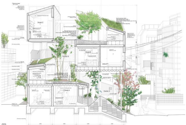 Comme expansion de la surface du sol de Tokyo, nous envisageons d'abord de construire dans le sens de la pente. Ensuite, le fait de dessiner la pente et la différence de niveaux dans le bâtiment nous fait réaliser que le logement collectif a trois unités d'habitations superposées, et nous en arrivons à l'idée de rassembler les trois maisons individuelles par des jardins. L'action d'empiler affecte le plafond de l'étage inférieur tout en créant une pente jusqu'à l'étage supérieur. À l'intérieur et à l'extérieur de chaque maison, le terrain a permis une différence de niveaux, tout en apportant quelque chose comme une forme de maison et une apparence. D'autre part, un espace extérieur continu comme un vide créé un jardin comme une maison imaginaire.