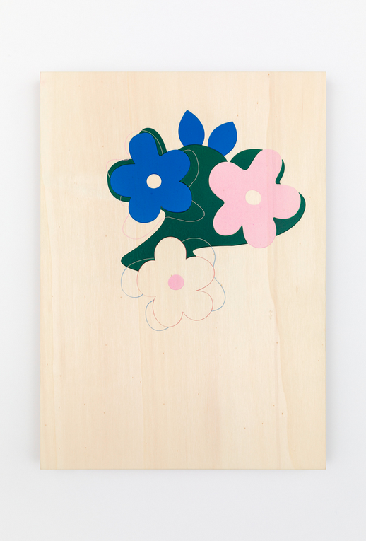 EV : Tu choisis donc parmi ces dessins des extraits qui seront agrandis et peints. Ici ce sont essentiellement des fleurs avec un cœur et des pétales rondelets esquissés d’un seul trait. S’ensuit une série de translations : les dessins sont scannés, vectorisés, transformés en pochoir, apposés sur le bois préparé puis peints. Un processus extrêmement long que l’on pourrait décrire plus en détail ?