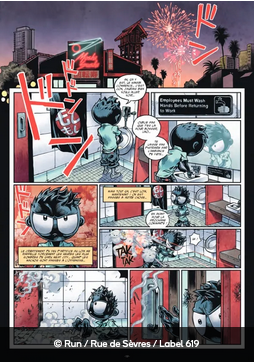 Cette nouvelle époque est aussi le retour de Run au dessin. Le style a un peu évolué, toujours très maîtrisé et stylisé, mais avec un peu plus de rondeur pour les personnages. Les cadrages et la mise en scène ont gagné en dynamisme, et la série renouvelle sa hype graphique. On sent tout le plaisir dans les scènes d’action avec ses jeux de plans, ses visions décalées de l’Amérique et l’album n’échappe pas à quelques ruptures graphiques qui servent la narration, la séquence du rêve ou celle de la « légende de Willy » marchent bien avec leur côté plus pictural (en aquarelle en couleur directe) en vis-à-vis du style plus encré du reste de l’album ou des inserts (faux téléphones, pubs,…)