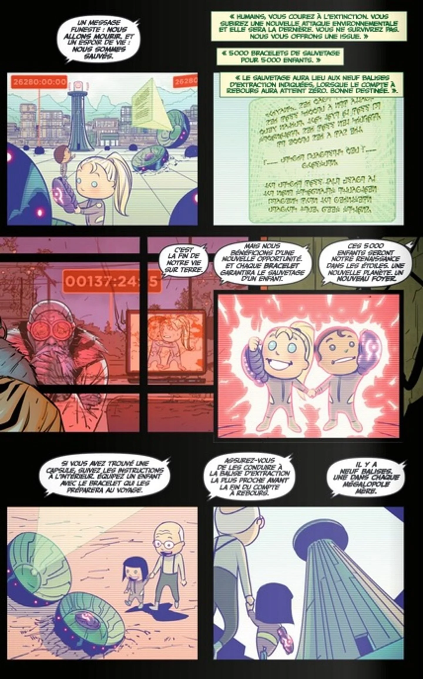 Cette vision de la Terre en 2084 est à la fois magique et tragique, la Nature a repris le dessus sur l’Humanité en 2050 à grand coup de catastrophes naturelles, de mutations et de rejet de l’espèce humaine. La faune et la flore ont muté et seulement 10% de la population mondiale a survécu à cette attaque. Réfugiés dans des villes fortifiées, Mégalopoles-mère, ou dans ses villages de brousse, les survivants découvrent un ultimatum laissé par des formes de vies intelligentes qui expliquent que la Terre se prépare à l’assaut final. Les aliens proposent de sauver 5 000 enfants humains, et seulement 5 000 qui doivent se regrouper dans les Mégalopoles-mère après avoir enfilé un bracelet de sauvetage.