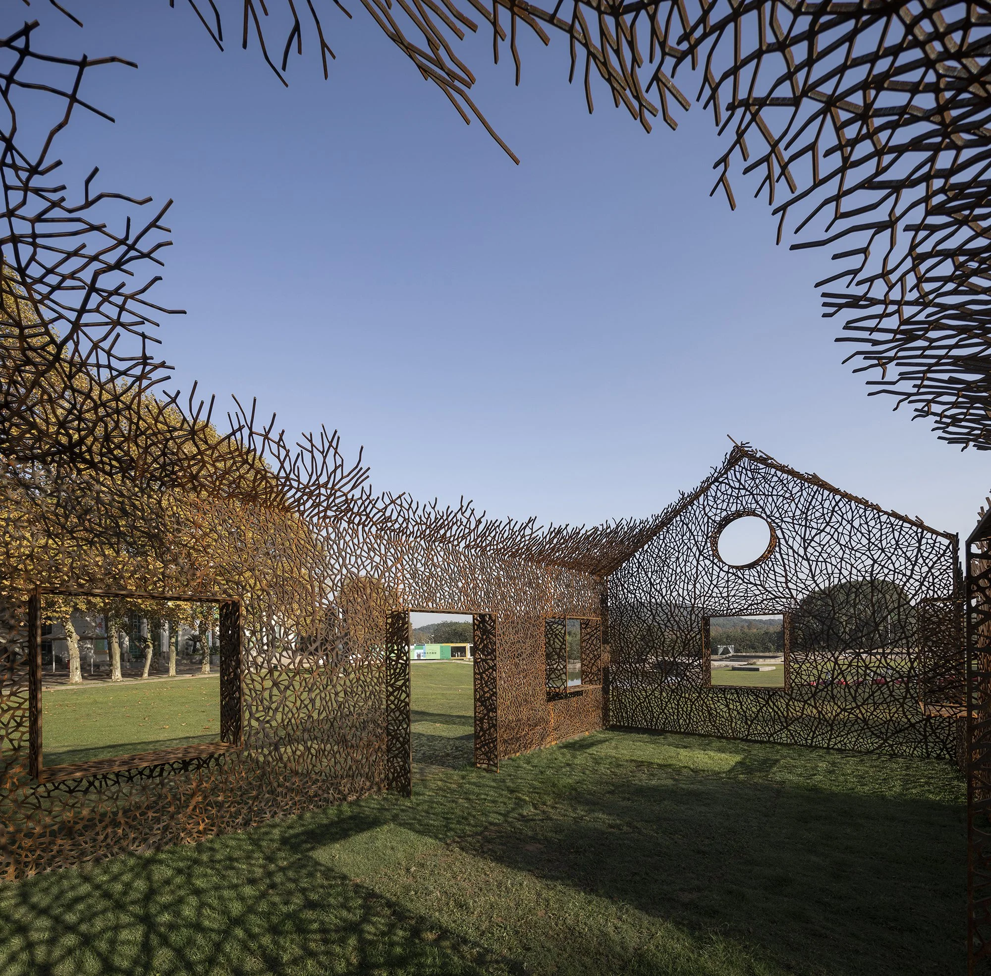 Après avoir choisi une maison "disparue" en résonance avec le lieu d'exposition, la question clé pour les concepteurs était de savoir quel type de maison choisir. Au début, ils ont pensé à choisir un type de maison avec des caractéristiques spécifiques à Wuhan pour présenter la localité. Toutefois, après avoir effectué des recherches, ils ont constaté que les vieux bâtiments de la ville, en particulier les immeubles résidentiels, ne présentaient pas de caractéristiques locales évidentes, tandis que les constructions publiques représentatives de Wuhan n'étaient pas des choix raisonnables pour un tel environnement. Finalement, l'équipe a décidé de choisir l'image la plus simple qu'une maison puisse être. N'impliquant ni localité ni symboles supplémentaires, il s'agissait d'une simple maison qui ressemblait à un croquis d'enfant. La forme, sans beaucoup d'artifices, ajoute plus de simplicité et de pureté à l'œuvre, tandis que les motifs des lianes tentaculaires introduisent plus de sophistication.