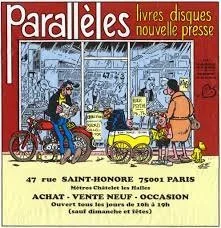 Je suis ému de reconnaître Pierre Scias qui tenait la Librairie Actualités rue Dauphine. J'y avais découvert L'Art vivant ou la première mouture d'Actuel, les journaux anglais It et Suck, les dessinateurs Crumb et Shelton ; nous y achetions le Parapluie d'Henri-Jean Enu où notre camarade Antoine Guerreiro avait fini par placer des dessins ou L'enragé dont je possède l'intégralité, mais surtout nous pouvions y discuter politique et musique, deux sujets qui commençaient à se fréquenter à la rentrée 68 quand on s'intéressait au rock et à la révolution. Philippe Bone, Christophe Bourseiller, Françoise Droulers, David Dufresne, Patrice Van Eersel, Henri-Jean Enu, Marsu, Daniel Paris-Clavel, Géant Vert et d'autres témoignent de la création de la Librairie Parallèles, rue Saint Honoré près du trou des Halles, et de son évolution, mais ce sont aussi ceux que j'ai croisés qui font remonter mes souvenirs : Gilles Yepremian rencontré au Lycée Claude Bernard, Philippe Thyiere qui avait pris le relais par ses conseils avisés, Thierry Delavau qui avait commandé Utopie standard à Un Drame Musical Instantané pour la compilation CD Passionnément du label V.I.S.A., Guillaume Dumora toujours de bon conseil au Monte-en-l'air lorsque je désire savoir ce que devient la bande dessinée... C'est pareil avec la musique. Dans la bande-son je retrouve Red Noise, Crium Delirium, Fille qui Mousse, etc., même si j'ai manqué la période punk avec les Béruriers Noirs.