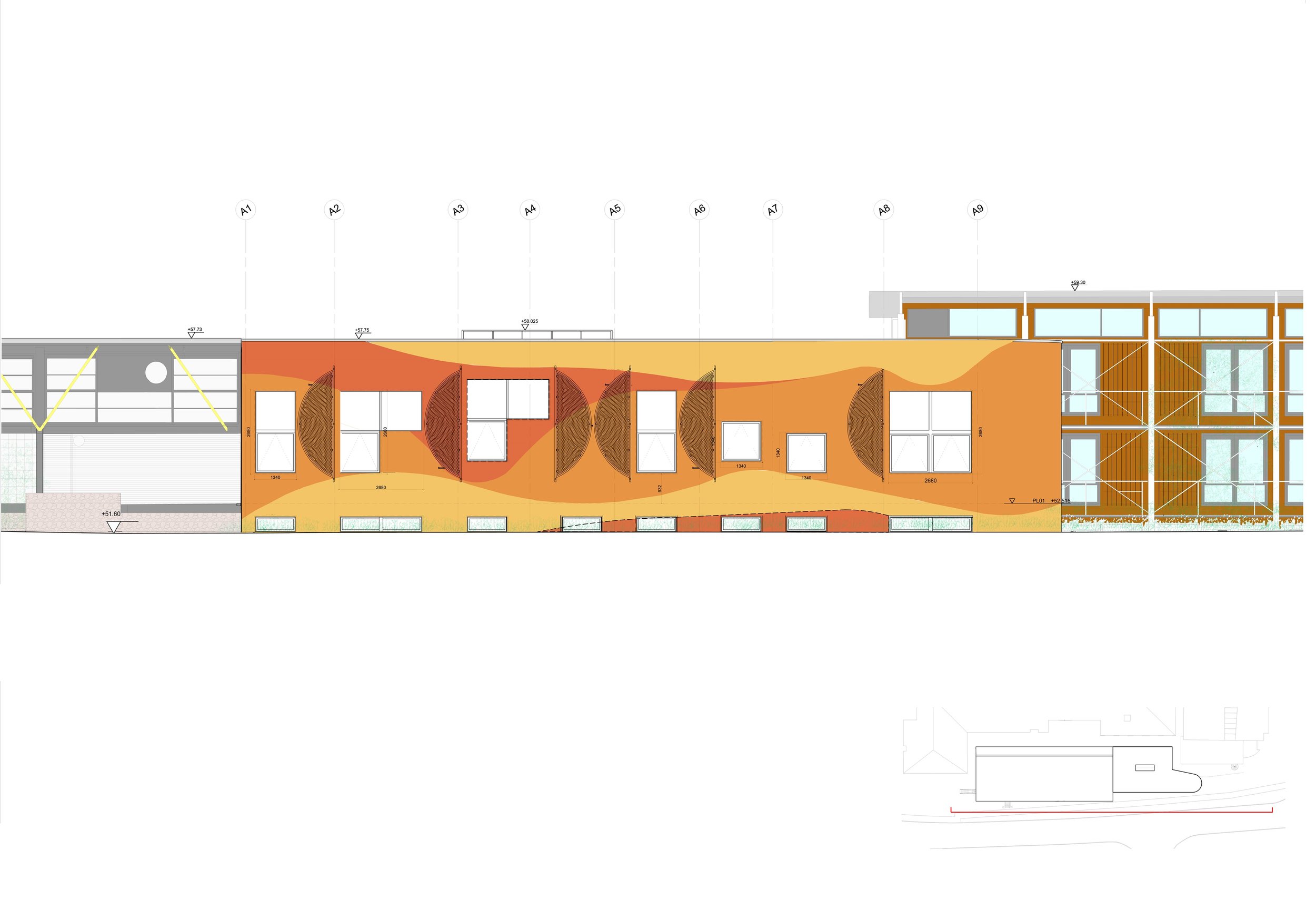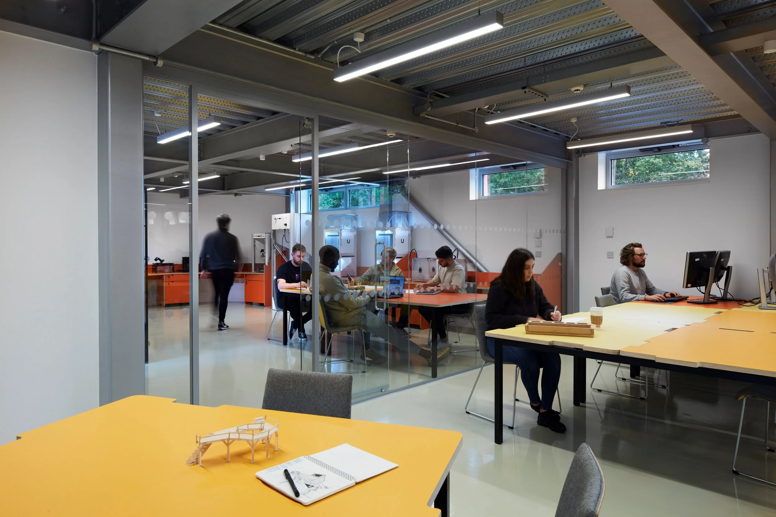 Le site consiste en un petit remplissage entre le bâtiment administratif de l'université et le bâtiment principal de l'atelier. Avec une connexion directe à l'atelier, le bâtiment brise délibérément les catégories de "bureau", "studio" et "atelier" - et est donc un hybride approprié pour la pratique future.