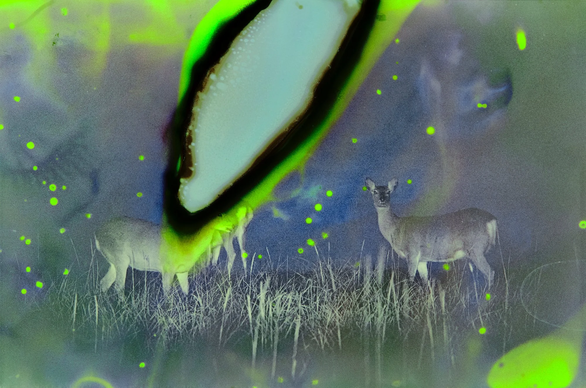 À première vue, les images de Tamaki Yoshida pourraient être interprétées comme l'expression abstraite d'un combat pour sauver notre planète. Créées à l'aide de perturbations chimiques orchestrées dans la chambre noire, elles dépeignent des paysages où les rouges profonds éclatent comme des flammes et où les blancs perçants engloutissent la vie sur la terre. Des corbeaux s'élèvent dans des cieux lavande tourbillonnants, tandis que des cerfs parcourent des paysages martiens éclairés d'un bleu électrique. Ces images sont vivantes et d'un autre monde, mais le photographe insiste sur le fait qu'elles ne sont pas abstraites.
