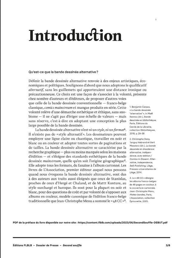 Sous-titré bandes dessinées alternatives 2000-2020, ce livre présente un panorama de l’édition alternative “deuxième génération” qui a pris la suite des structures indépendantes comme L’Association, Cornélius, 6 pieds sous terre, Les Requins Marteaux… et qui ont à leur manière elles-aussi changées le paysage éditorial dans les décennies où les gros éditeurs ont eu aussi investi le champs de la bande dessinée alternative via des collections dédiées. Dans Second Souffle l’auteur interroge les éditeur.trice.s de 11 maisons d’édition pour en faire un bilan à date, en évoquer les albums clefs, les chiffres et les spécificités.