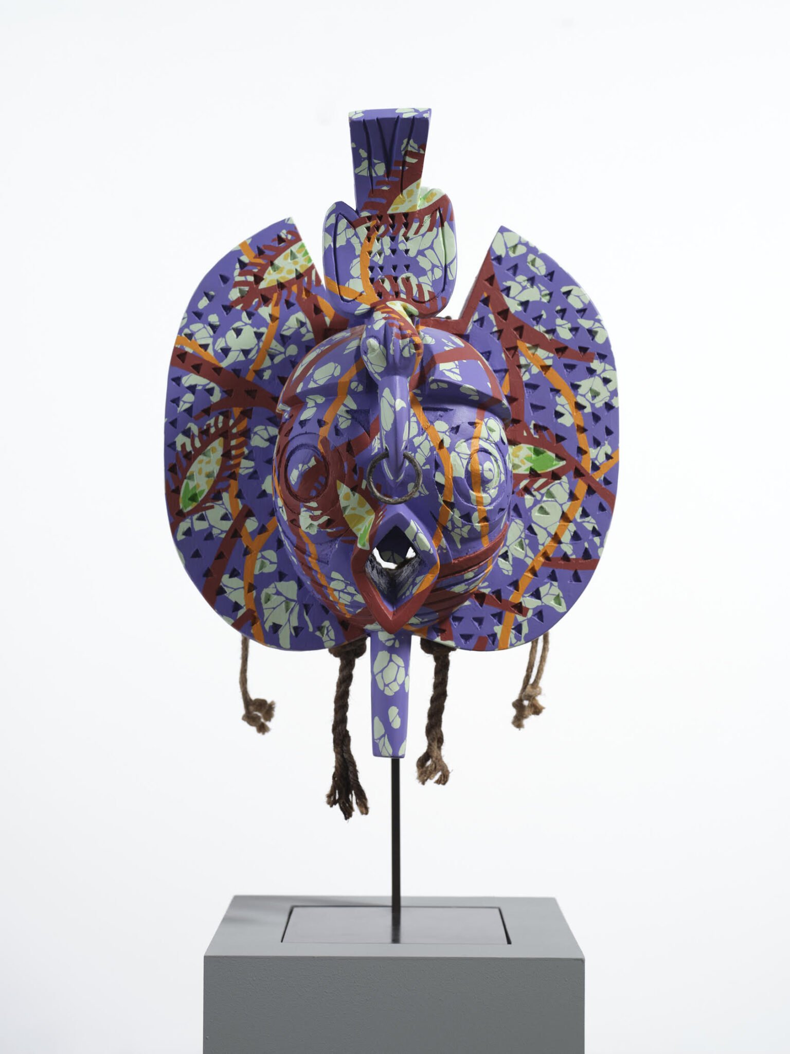 “Hybrid Mask (Tsogho)” (2022), wood, acrylic paint, raffia, and brass, 74 x 45 x 15 centimeters. Photo by Stephen White & Co., courtesy of Stephen Friedman Gallery