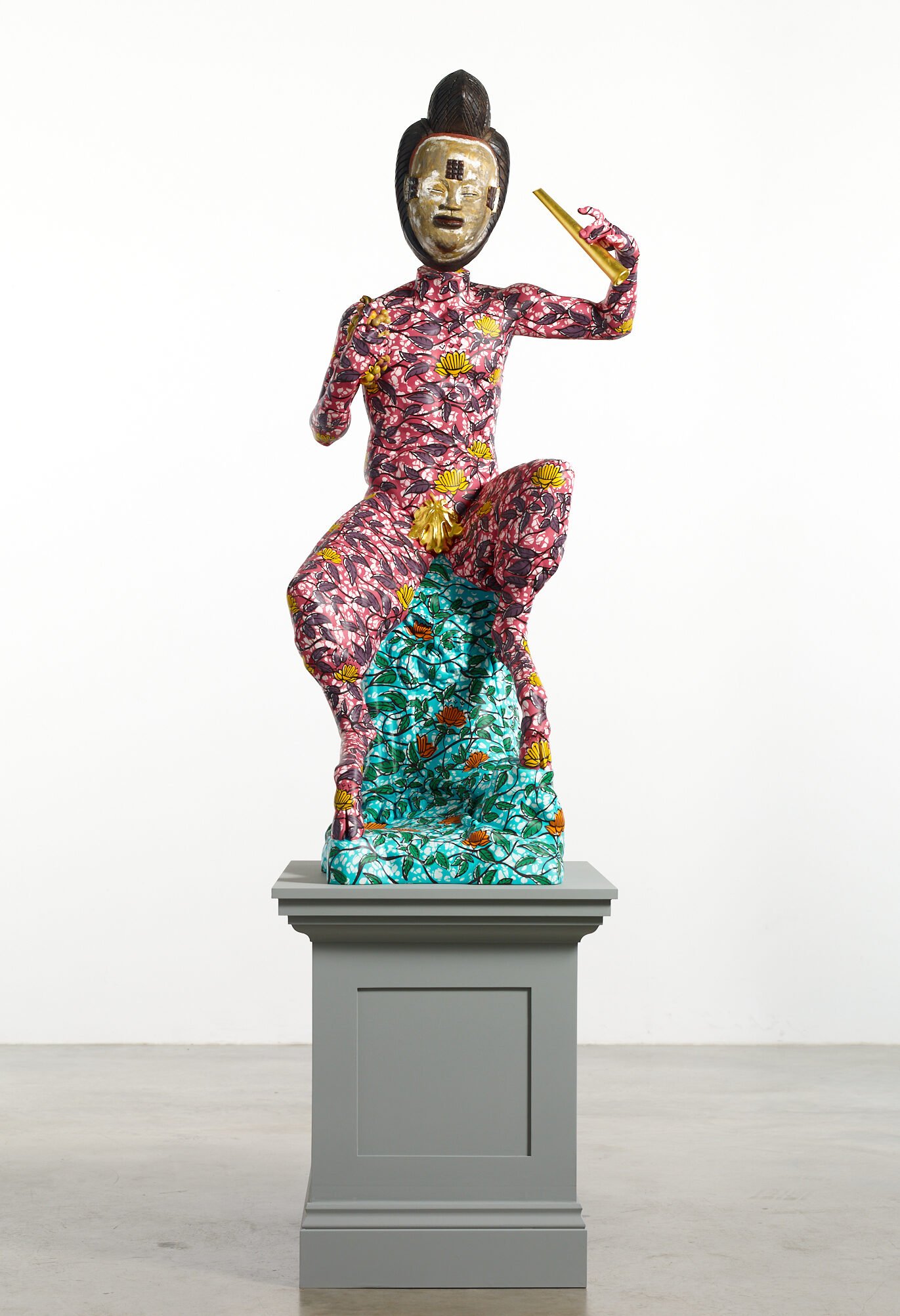 “Hybrid Sculpture (Pan)” (2021), fiberglass sculpture hand painted with Dutch wax pattern, with hand-carved wooden mask, 152 x 68 x 72 centimeters. Photo by Stephen White & Co., courtesy of Stephen Friedman Gallery